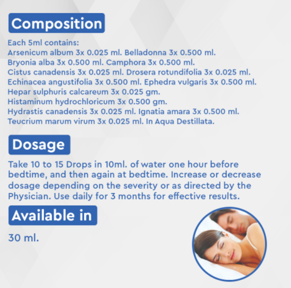 Arsenicum album 3x 0.025 ml. Belladonna 3x 0.500 ml. Bryonia alba 3x 0.500 ml. Camphora 3x 0.500 ml. Cistus canadensis 3x 0.025 ml. Drosera rotundifolia 3x 0.025 ml. Echinacea angustifolia 3x 0.500 ml. Ephedra vulgaris 3x 0.500 ml. Hepar sulphuris calcareum3x 0.025 gm. Histaminum hydrochloricum 3x 0.500 gm. Hydrastis canadensis 3x 0.025 ml. Ignatia amara 3x 0.500 ml. Teucrium marum virum 3x 0.025 ml.