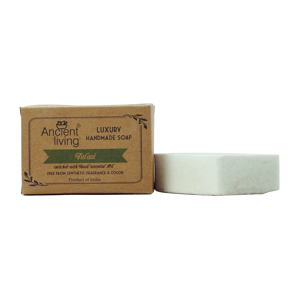 Ancient Living Tulasi Handmade Soap is enriched with pure basil essential oil, Tulasi powder along with other nutrient-rich skin nourishing oils. This Krishna Tulasi soap purifies your skin by getting rid of impurities. Thus, it gives a beautiful, healthy, glowing complexion. Tulasi powder acts as a gentle exfoliator as it's known for its detoxifying properties. It soothes inflammations, brightens your skin and invokes feelings of relaxation due to its pleasant aroma. Our handmade Tulasi bar is infused with basil essential oil whose antibacterial properties fight off skin problems. This basil soap is rich in vitamin C and other antioxidants. Its refreshing aroma reduces, keeps you healthy and energized. Where these protect your skin, coconut oil and palm oil nourish your skin and keep it moisturized. Sweep this soft, fluffy lather to wash away germs and to feel refreshed and rejuvenated!" Benifits: "Tulasi powder It is a detoxifying agent which exfoliates. Tulsi purifies and cleanses your skin. It soothes inflammation. It is an antioxidant. It possesses antibacterial properties that fight skin diseases. Its pleasing aroma invokes feelings of relaxation. Basil essential oil It's rich in vitamin C and other antioxidants. It fights off skin infections and diseases. Its refreshing aroma keeps you healthy and energized. It prevents the outburst of blackheads and whiteheads. It gives you a clear, glowing complexion. It is known for its cooling properties which have immediate cooling effects that keep you fresh. Coconut oil Our coconut oil is organic and certified. This age-old oil nourishes your skin and eliminates toxins. It acts as an exfoliator and removes dead skin cells. It combats dryness and moisturizes your skin. Palm oil It is loaded with antioxidants and vitamin A which protects your skin from harmful UV rays. It helps in keeping your skin soft and non-greasy. It is full of vitamin which E which fights signs of aging. TULASI SOAP BENEFITS: Its excellent for all skin types, especially for dry skin types. Nourishes and exfoliates your skin. Relieves stress and fatigue and uplifts your mood. Restores the suppleness of your skin. Eliminates impurities. It helps maintain a clear skin tone. Promotes a clear, glowing complexion. " Ingredients: Tulasi,Basil essential oil,Palm oil,Coconut oil and Lye. How to use: Wet body and face,apply generously and rinse.