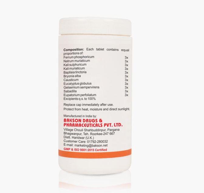 Ferrum phosphoricum 3x, Natrum muriaticum 3x, Kali sulphuricum 3x, Kali muriaticum 3x, Baptisia tinctoria 3x, Bryonia alba 3x, Causticum 3x, Eucalyptus globulus 3x, Gelsemium sempervirens 3x, Sabadilla 3x & Eupatorium perfoliatum 3x..