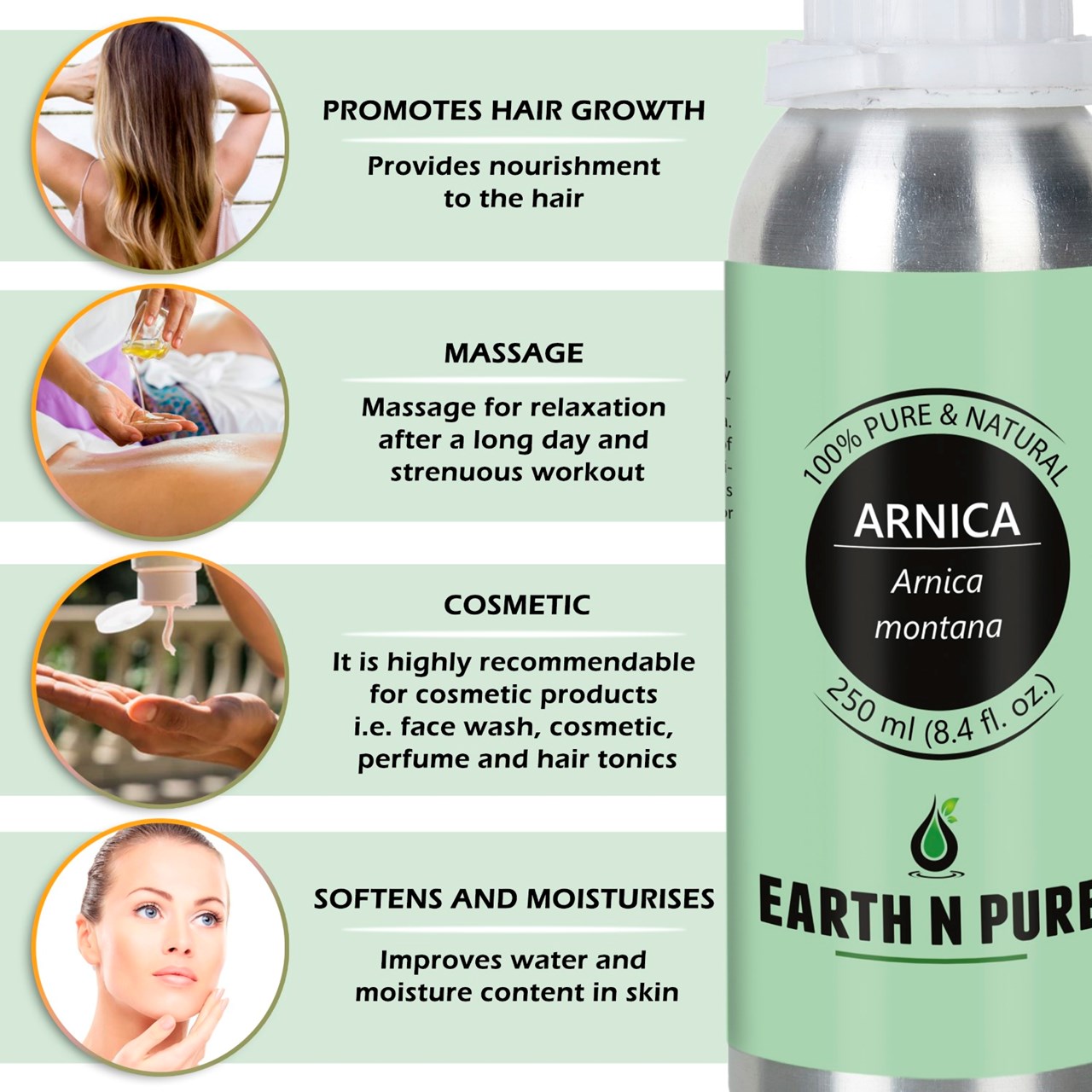 - CLEANER AND HIGH-QUALITY AFFORDABLE OILS: At Earth N Pure our goal is to positively impact the lives of as many people as we possibly can, by selling such a high quality product at an affordable price. Be sure while purchasing Earth N Pure Arnica Oil as it is physically refined thus made more stable for extended shelf life.