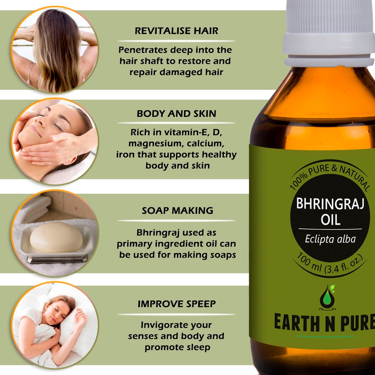 - CLEANER AND HIGH-QUALITY AFFORDABLE OILS: At Earth N Pure our goal is to positively impact the lives of as many people as we possibly can, by selling such a high quality product at an affordable price. Be sure while purchasing Earth N Pure Bhringraj Oil as it is physically refined thus made more stable for extended shelf life.