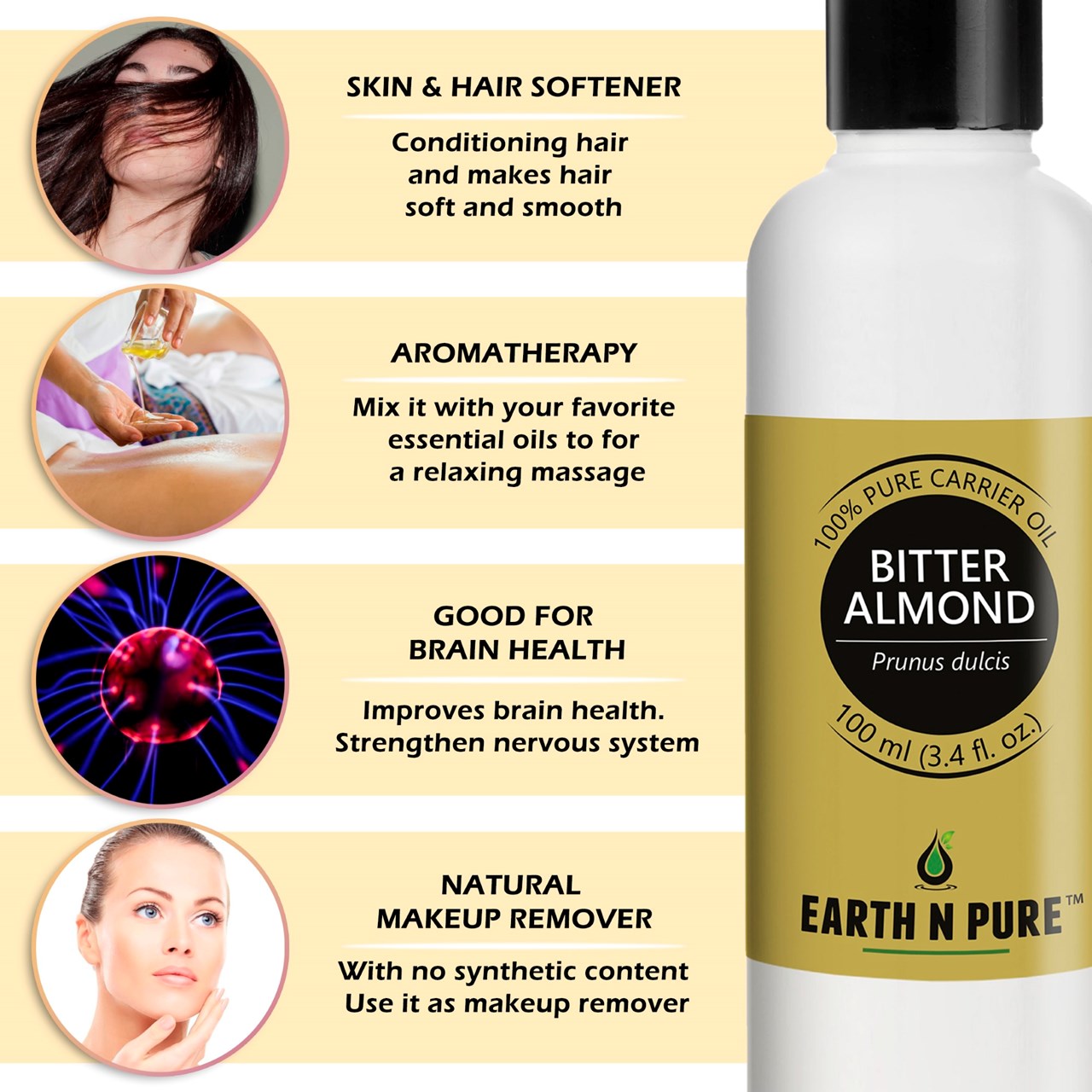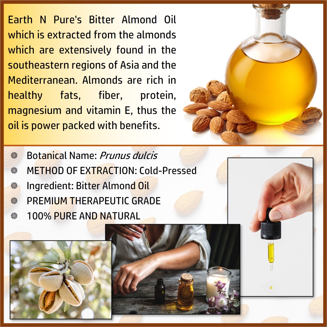 - CLEANER AND HIGH-QUALITY AFFORDABLE OILS: At Earth N Pure our goal is to positively impact the lives of as many people as we possibly can, by selling such a high quality product at an affordable price. Be sure while purchasing Earth N Pure Bitter Almond Oil as it is physically refined thus made more stable for extended shelf life.