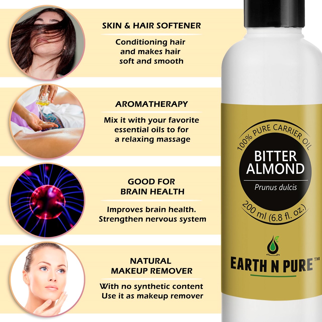 - CLEANER AND HIGH-QUALITY AFFORDABLE OILS: At Earth N Pure our goal is to positively impact the lives of as many people as we possibly can, by selling such a high quality product at an affordable price. Be sure while purchasing Earth N Pure Bitter Almond Oil as it is physically refined thus made more stable for extended shelf life.