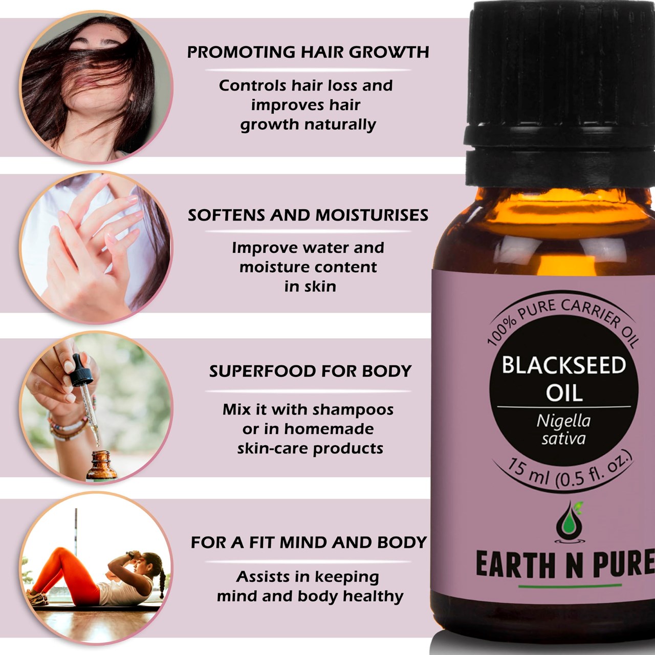 - BODYCARE WITH BLACKSEED OIL – Made with pure and undiluted Nigella sativa, DIY is just the next step. Make your own beauty and well-being products with Blackseed Oil and other high quality ingredients from Earth N Pure. Discover recipes to create handmade soap, moisturizer, Blackseed Oil face wash, and other loveliness products.