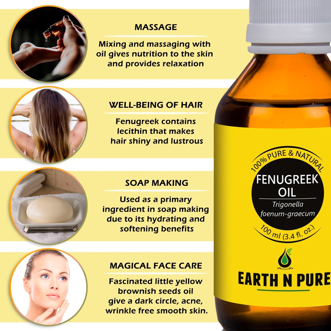 - BODYCARE WITH FENUGREEK OIL – Made with pure and undiluted Trigonella foenum-graecum, DIY is just the next step. Make your own beauty and well-being products with Fenugreek Oil and other high quality ingredients from Earth N Pure. Discover recipes to create handmade soap, moisturizer, Fenugreek Oil face wash, and other loveliness products.