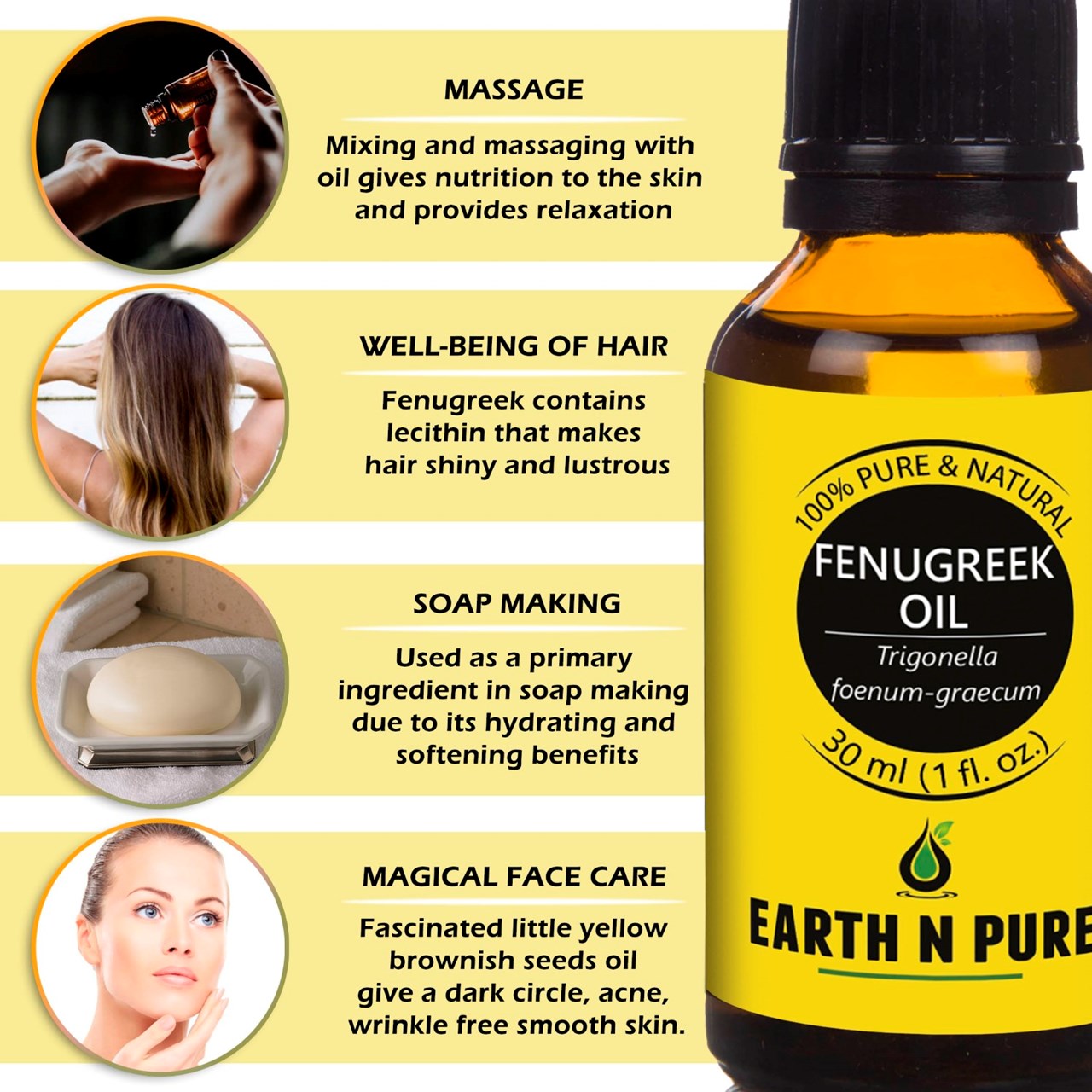 - BODYCARE WITH FENUGREEK OIL – Made with pure and undiluted Trigonella foenum-graecum, DIY is just the next step. Make your own beauty and well-being products with Fenugreek Oil and other high quality ingredients from Earth N Pure. Discover recipes to create handmade soap, moisturizer, Fenugreek Oil face wash, and other loveliness products.