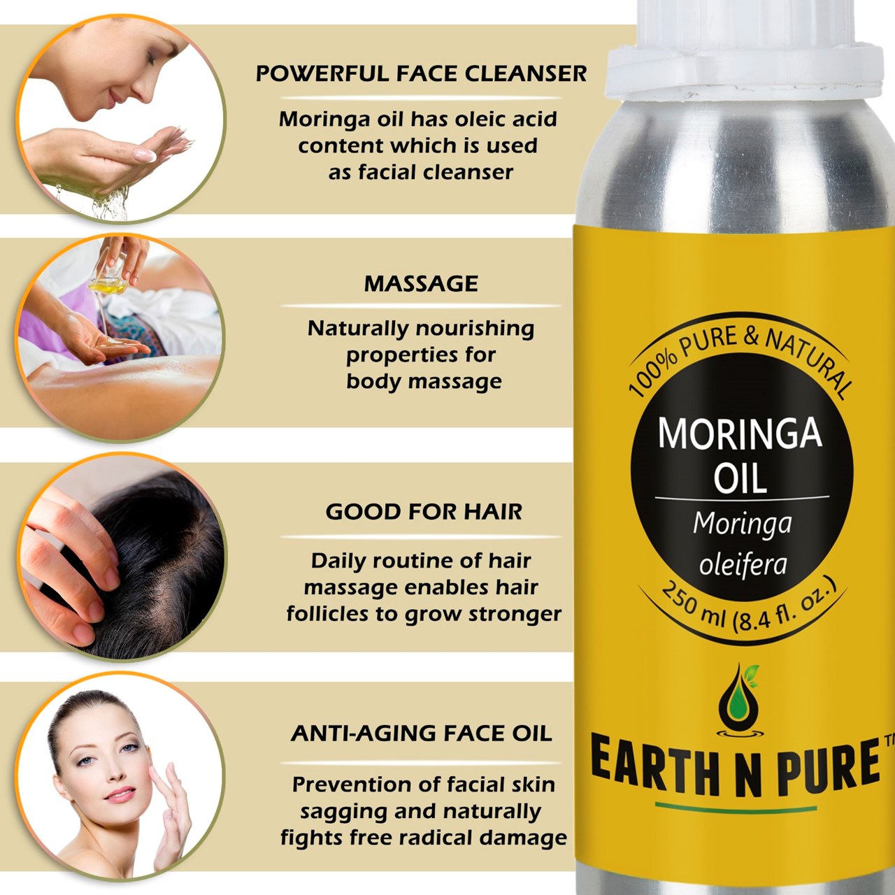- CLEANER AND HIGH-QUALITY AFFORDABLE OILS: At Earth N Pure our goal is to positively impact the lives of as many people as we possibly can, by selling such a high quality product at an affordable price. Be sure while purchasing Earth N Pure Moringa Oil as it is physically refined thus made more stable for extended shelf life.