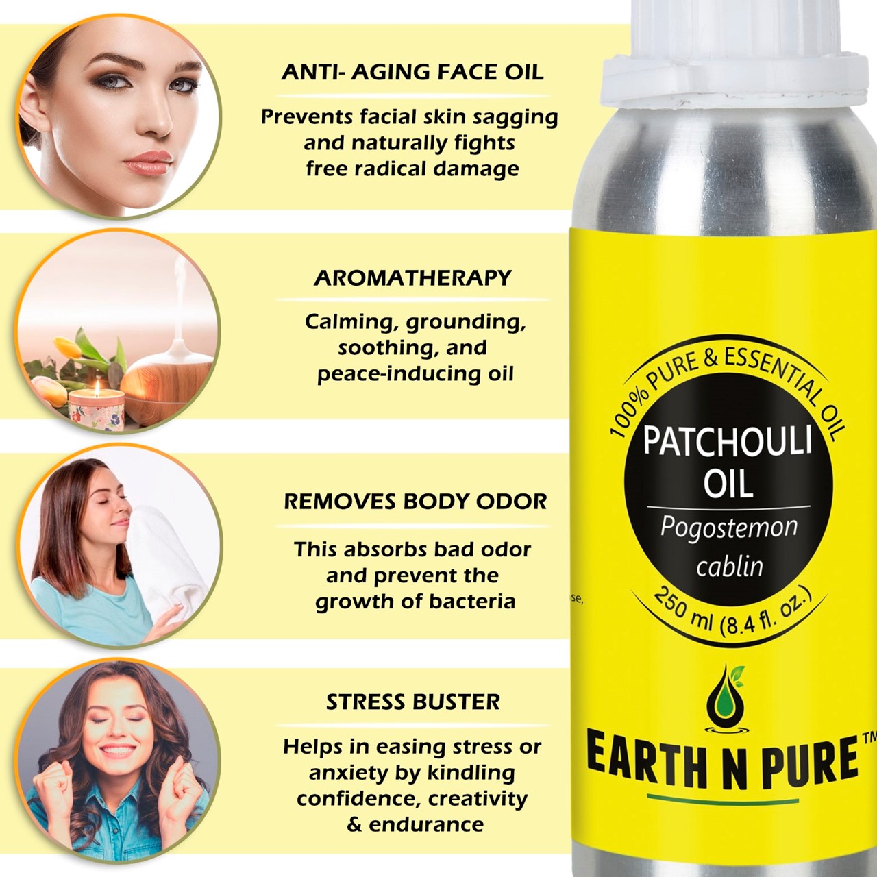 - BODYCARE WITH PATCHOULI OIL – Made with pure and undiluted Pogostemon cablin, DIY is just the next step. Make your own beauty and well-being products Patchouli Oil and other high quality ingredients from Earth N Pure. Discover recipes to create handmade soap, moisturizer, Patchouli Oil face wash, and other loveliness products.