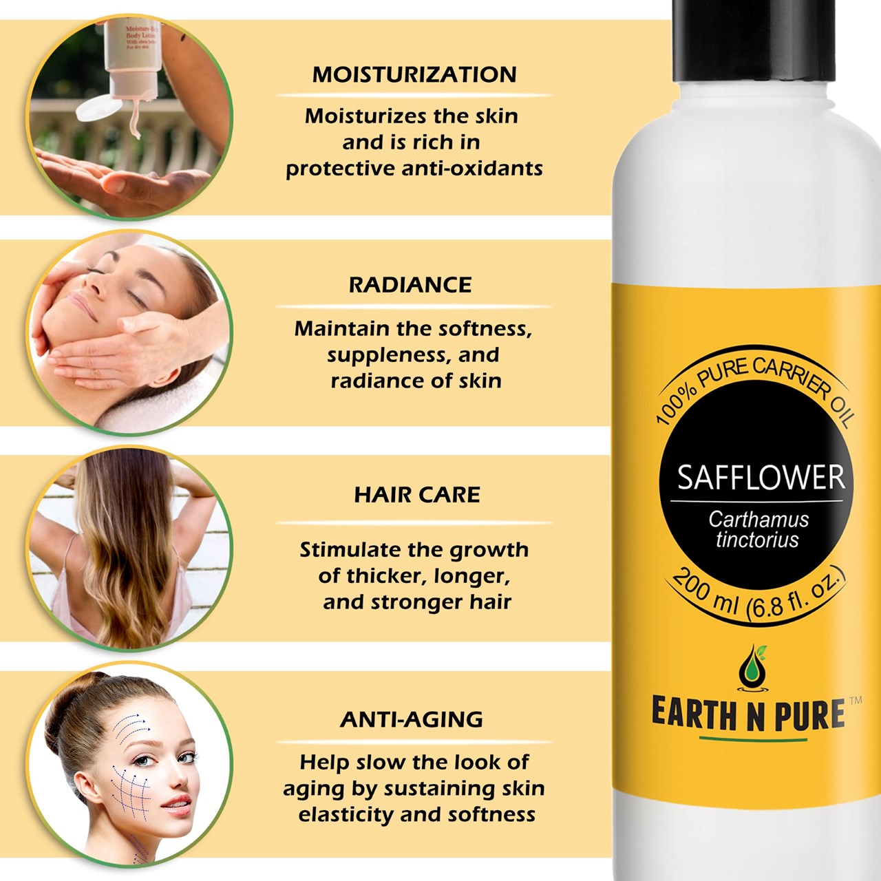 - CLEANER AND HIGH-QUALITY AFFORDABLE OILS: At Earth N Pure our goal is to positively impact the lives of as many people as we possibly can, by selling such a high quality product at an affordable price. Be sure while purchasing Earth N Pure Safflower Oil as it is physically refined thus made more stable for extended shelf life.