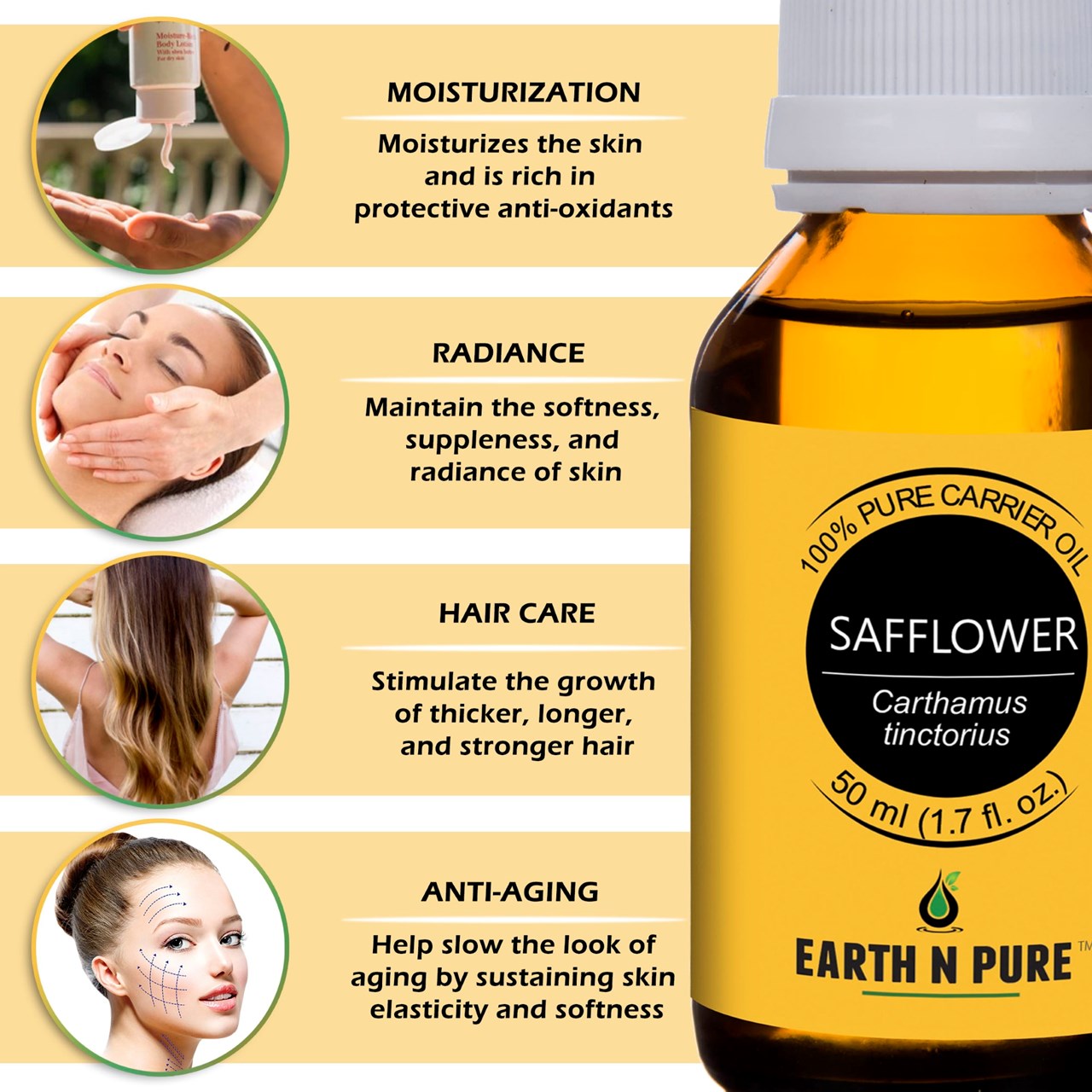 - BODYCARE WITH SAFFLOWER OIL – Made with pure and undiluted Carthamus tinctorius, DIY is just the next step. Make your own beauty and well-being products with Safflower Oil and other high quality ingredients from Earth N Pure. Discover recipes to create handmade soap, moisturizer, Safflower Oil face wash, and other loveliness products.