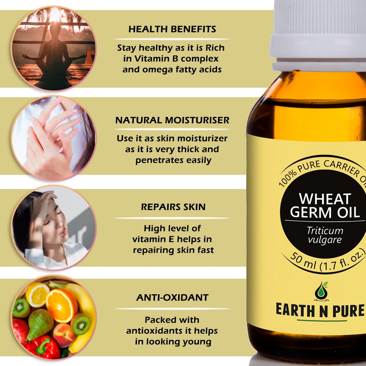 - CLEANER AND HIGH-QUALITY AFFORDABLE OILS: At Earth N Pure our goal is to positively impact the lives of as many people as we possibly can, by selling such a high quality product at an affordable price. Be sure while purchasing Earth N Pure Wheat germ Oil as it is physically refined thus made more stable for extended shelf life.