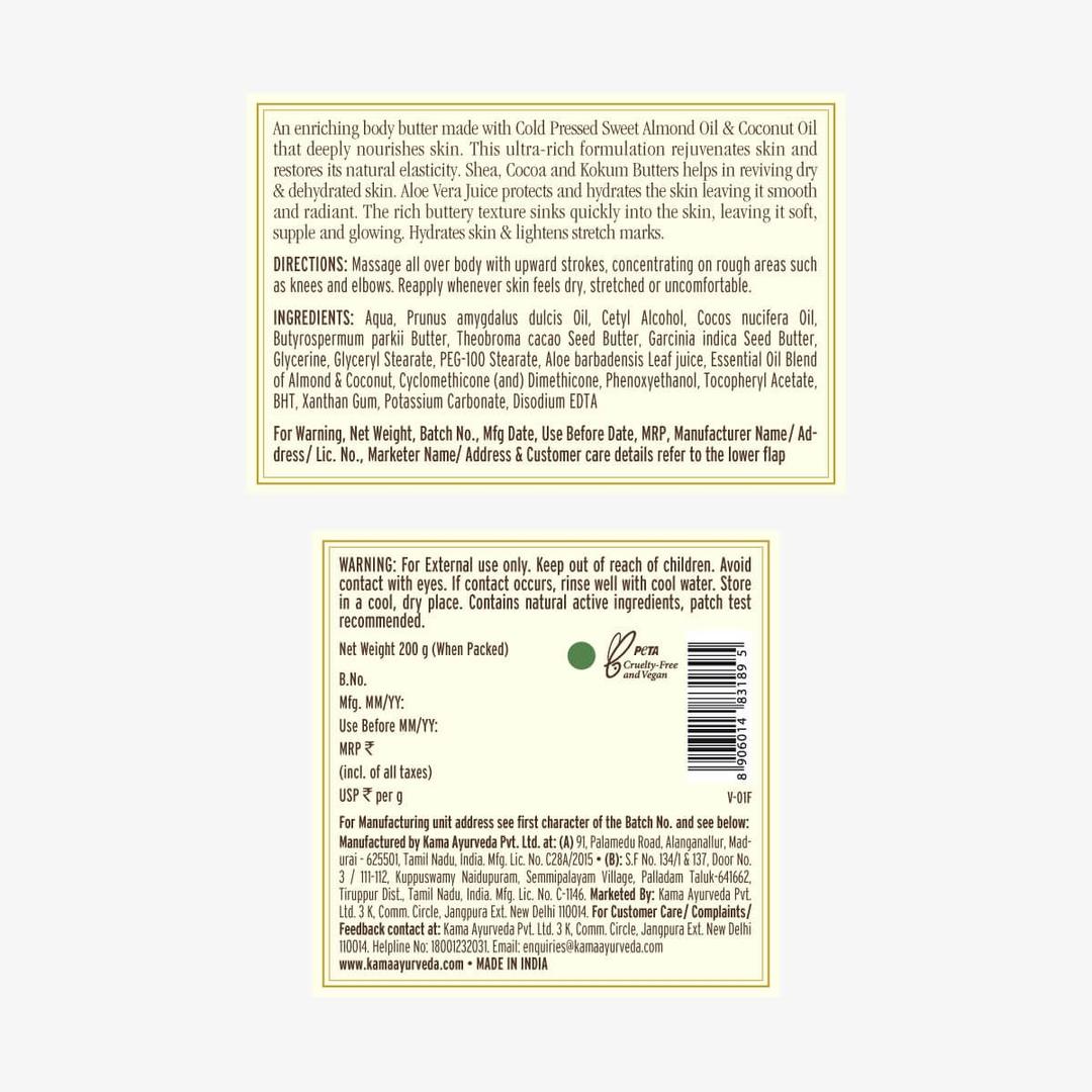 An enriching body butter made with 100% organic cold pressed Sweet Almond Oil & Coconut Oil. Rich in fiber, Vitamin A, E and minerals, which relieve dryness and have natural antioxidants to increase elasticity of the skin. Blended with Shea Butter, Cocoa Butter and Kokum Butter, it helps in regenerating skin cells and is beneficial for lightening stretch marks. Aloe Vera juice is an antiseptic agent that protects the skin. An intensive moisturizer which hydrates, moisturizes and improves skin tone reviving its natural glow.
