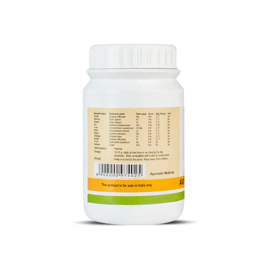 Take 10-15 gm of Avipathi Choornam with a glass of lukewarm water daily at bedtime or as the physician directs.