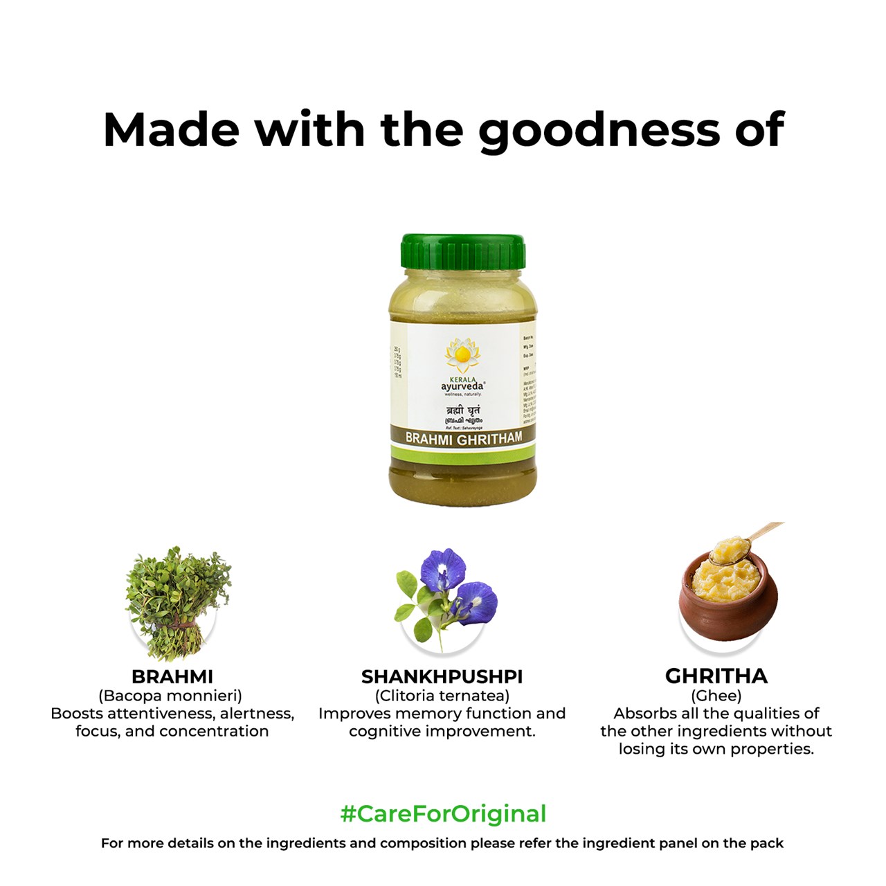 Keraleeya Ayurveda text, ‘Sahasrayogam,’ this potent supplement is enriched with herbs like Brahmi & Sankupushpi, which have been trusted for centuries to improve mental acuity, concentration, clarity of thoughts, and recall. Based on the wisdom of the Vedas, these herbs are slowly simmered in pure cow ghee to extract all of their natural goodness. Don't let forgetfulness hold you back - unlock your cognitive potential with Kerala Ayurveda Brahmi Ghritham.