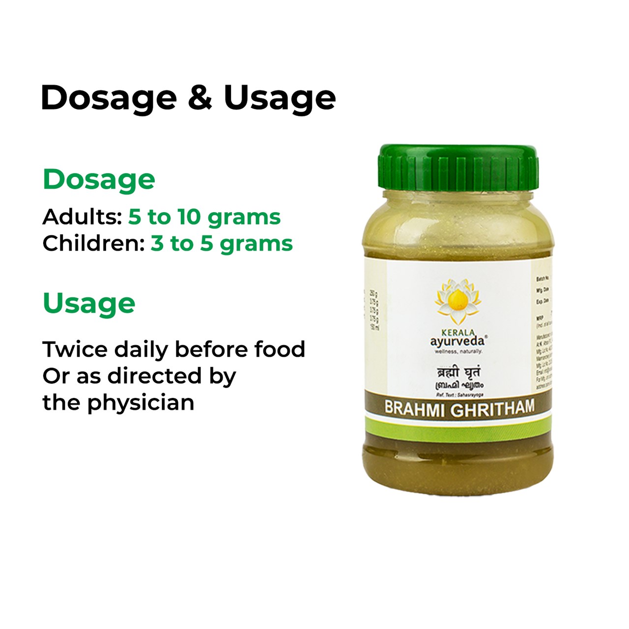 Kerala Ayurveda Brahmi Ghritham should be consumed about 1 hour before food, twice daily.