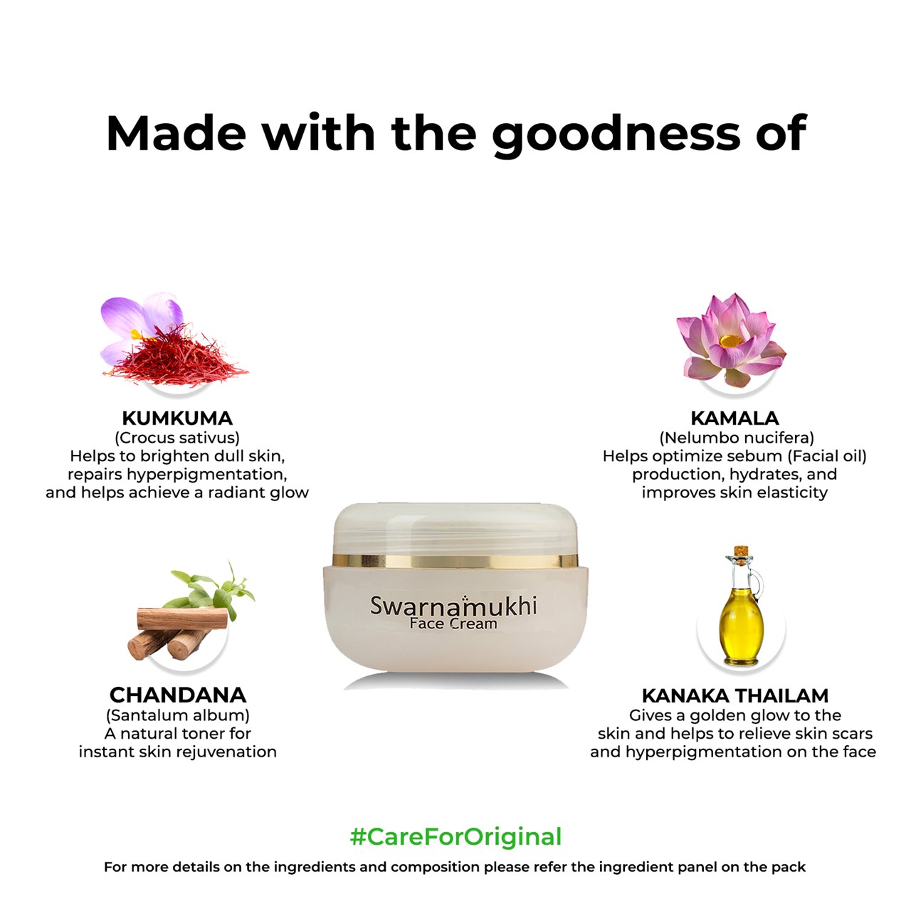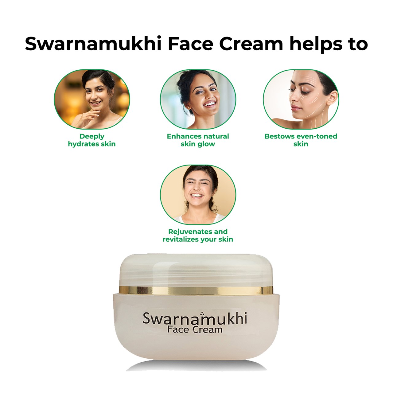 Do you want to try a completely authentic and natural product that can give your face a fresh, natural, and radiant daily glow? Swarnamukhi face cream, made purely from herbal and natural ingredients, is a complete skin nourishment solution because of its potency to improve skin texture, protect skin against free radicals, and tone your complexion. Swarnamukhi face cream is Ayurveda’s remedy to soften your skin with its moisturizing and restorative properties. It is excellent for reducing wrinkles, restoring skin elasticity, and imparting a natural glow. Kerala Ayurveda Swarnamukhi Face Cream is an Ayurvedic face cream for hydrated and soft skin. This cream's unique kanthi vardaka or skin-brightening herbs, gives you even-toned, bright, and plump skin every day. It has ingredients like Saffron or Kumkuma, Lotus or Kamala, Indian Madder or Manjistha, Sandalwood or Chandana processed with nourishing Kanaka thailam and Thila thailam. It will be an ideal addition to your skincare routine for hydrated and smooth skin.