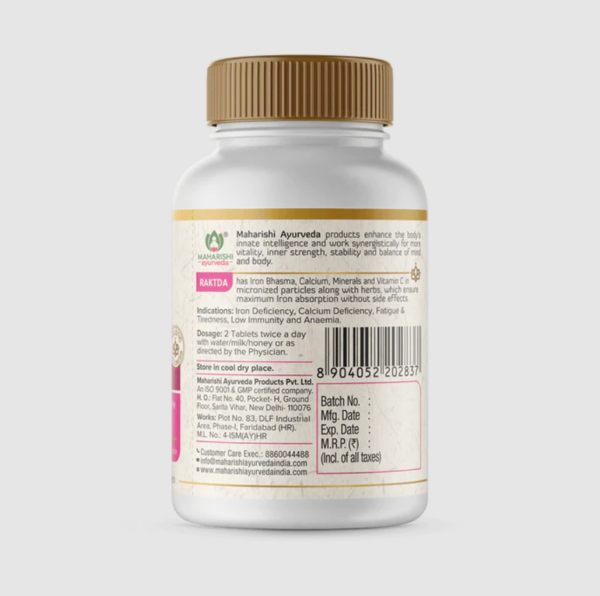 Maharishi Ayurveda Raktda is an Ayurvedic supplement that not only supplements iron but is also enriched with natural vitamin C, which improves the body's natural ability to absorb iron. It helps maintain optimum haemoglobin levels due to the presence of Kant Lauh Bhasma and iron oxide (Mandur Bhasma), which are easily absorbed and assimilated by the body. The remarkable aspect of our formulation lies in the process of Bhasma creation, which converts elemental iron, often toxic in its natural state, into an organic, readily bioavailable form. This transformation ensures that the iron is easily absorbed in the gut, enhancing its efficacy without any adverse side effects