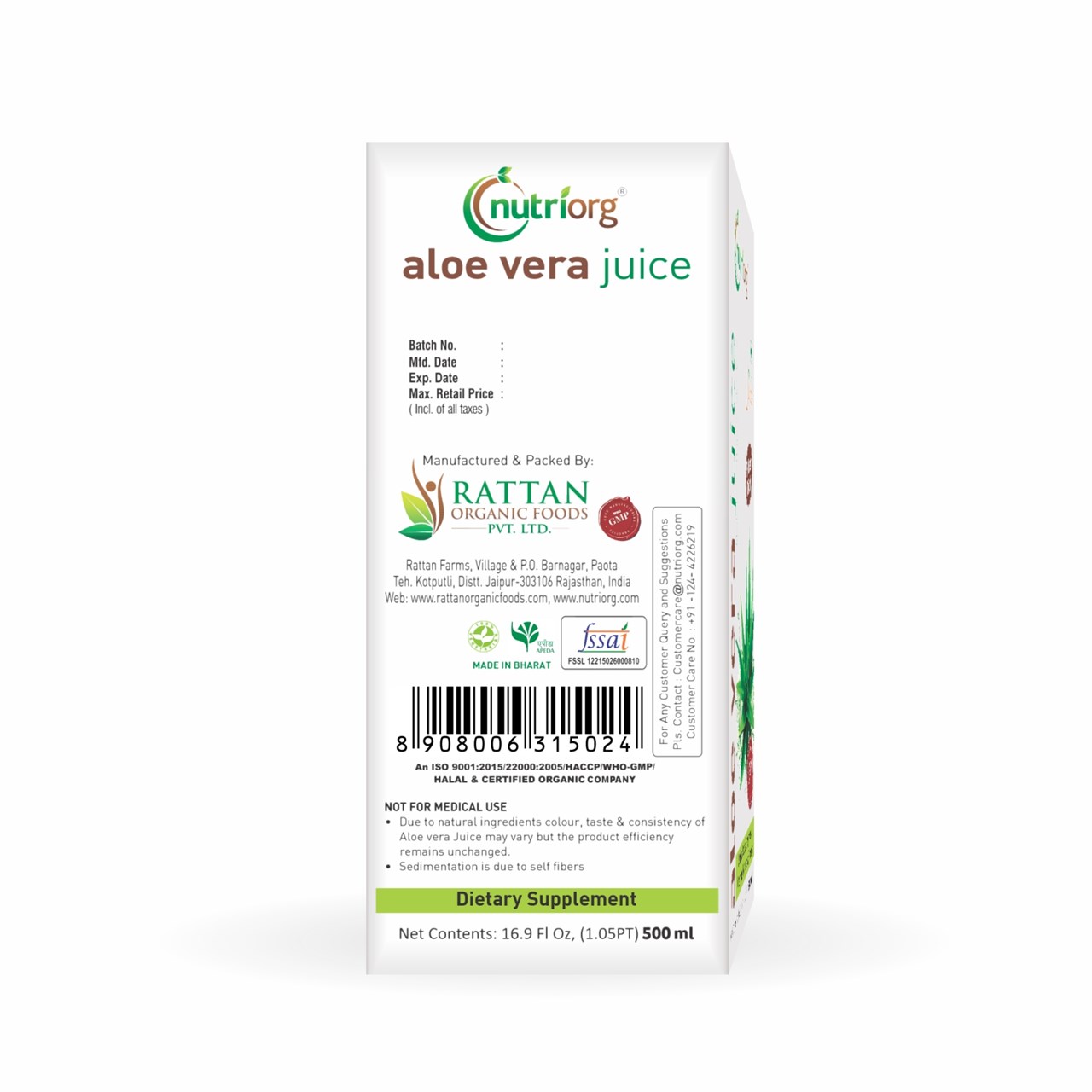 Aloe Vera is a multifaceted medicinal plant. The plethora of values and qualities that an Aloe Vera plant possesses can remotely be compared to any other plant or herb. In the world of Ayurveda it has earned the title of the silent healer and finds numerous mentions in the Ramayana, the Bible and the Vedas. It is known for the regulation of metabolism as it contains various enzymes which help in the digestion of carbohydrates, proteins and fats. Aloe vera is rich in B12 which is usually solely present in animal sources, thus acts as a good source for vegetarians and vegans. It prevents dehydration of the body. The Nutriorg Aloe vera Juice heals wounds and cuts and is beneficial for a healthy skin. The Aloe Vera plant has a history of over 5000 years; people have used it for various medicinal purposes in the past. From Queen of Egypt Cleopatra to Mahatma Gandhi everyone has preached its health benefits. No doctor can overlook the medicinal values that the Aloe Vera plant embodies.• The Nutriorg Aloe vera Juice works wonders for aiding the decline in the glucose levels in the blood.• It helps in metabolism and detoxification.• Aloe vera checks constipation as it works as a laxative• Aloe vera is power packed with nutrients as it is a powerhouse of Vitamins C, E and Beta Carotenes and traces of B12. Minerals like sodium, potassium, magnesium, copper and zincet care also present which are required for the body for building a healthy foundation• It helps elevate constipation, obesity, back pain.•Mix 15-20 ml of Nutriorg Aloevera Juice in 200 ml of lukewarm water in a non-metallic pot and consume empty stomach twice a day preferably morning and evening.Organic Alovera