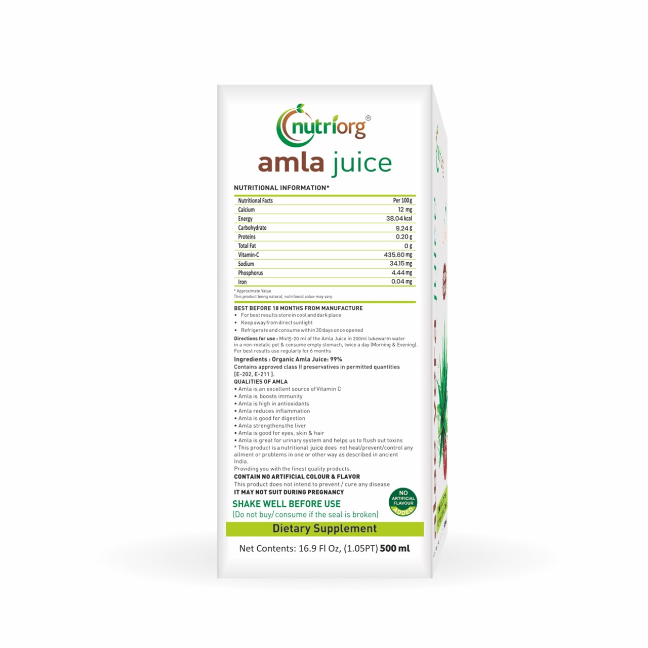 Nutriorg Amla Juice is made from Organic Amla, cultivated in the company's certified organic farmland situated in Rajasthan. Nutriorg Amla Juice is 100% pure and unadulterated. Amla is the richest source of vitamin C. It also helps in improving the efficacy of other vitamins in the body. Amla is also known to improve vitality. Amla is considered the most potent herb to manage overall health and well being.