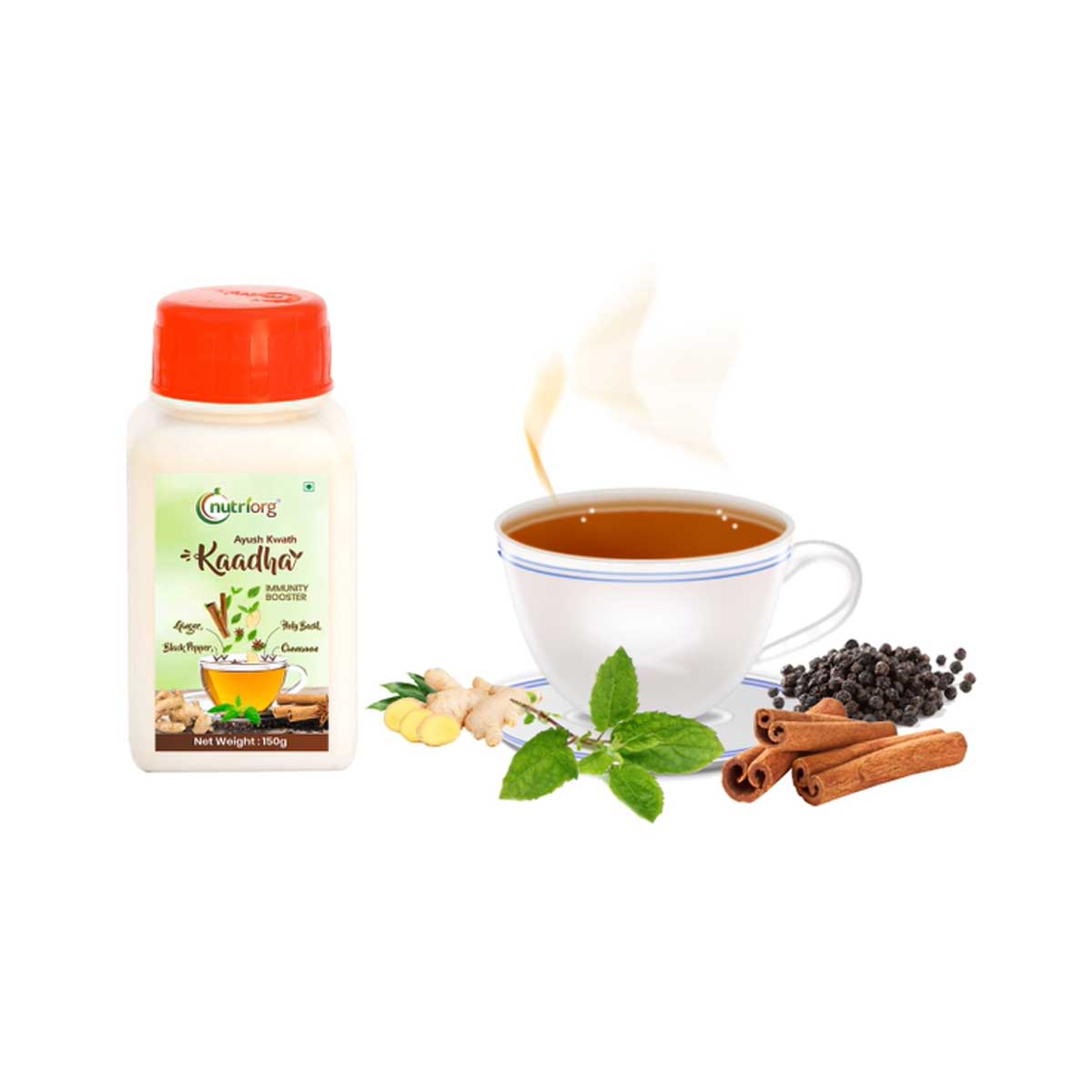 Kadha is an Ayurvedic home remedy that could defend you, make you more sustainable from within and also aids in fighting seasonal ailments. Kaadha is originally an Ayurvedic drink prepared with specific herbs and spices that are boiled in water to draw out their essential benefits. With a variety of whole spices, ingredients and herbs easily found in an Indian household, the concoction is an inexpensive home remedy to strengthen your immunity and fight germs. Kaadha is basically prepared with ingredients that can’t be juiced like dry spices and herbs. The best way to extract their benefits and medicinal qualities is to make a decoction along with other natural immunity boosters like ginger, honey and tulsi• Cinnamon and ginger aid digestion, which is a chief organ of the immune systemKadha is an Ayurvedic home remedy that could defend you, make you more sustainable from within and also aids in fighting seasonal ailments• Ginger is an effective ingredient for congestion, sore throat, cold and cough• Ginger is effective for sore throats, colds and coughs due to its high antioxidant properties• Since cinnamon is rich in iron and calcium and when had along with the ginger, it helps aid digestion that has a direct impact on our immunity• Add ½ Tablespoon of Kwath Kaadha into 150 ml of water. • Consume twice a day preferably morning and evening or as directed by the physician. • Consume regularly for best resultsGinger, Holy Basil, Black Pepper, Cinnamon