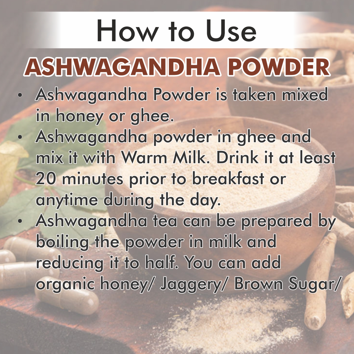 Ashwagandha tea can be prepared by boiling the powder in milk and reducing it to half. You can add organic honey/ Jaggery/ Brown Sugar/ Organic Sugar to improve the taste while it is boiling.