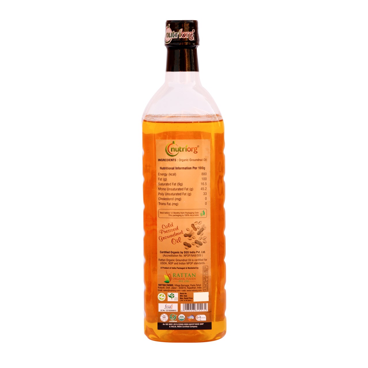Groundnut or peanut oil is a good all purpose oil for cooking as it has good polyunsaturated and monounsaturated fat (MUFA & PUFA) and is low in saturated fats therefore it is believed to lower chances of atherosclerosis (stroke or a heart attack). The oil is high in energy and has high burning and smoking point. Nutriorg brings to you certified organic groundnut oil which is hygienically extracted from organically grown peanuts. It has added advantage for your health since it is multi-faceted oil and is organically grown. The groundnut oil contains unsaturated fats, replacing saturated and Trans fats with unsaturated fats can reduce the risk of heart diseases by lowering bad cholesterol levels. Groundnut oil is a natural source of phytochemicals, antioxidants that protect the body from damage due to toxins and free radicals. Groundnut oil is a natural source of phytochemicals, antioxidants that protect your body from damage from toxins and free radicals. Peanut oil is rich in phytosterols beta-sitosterol.