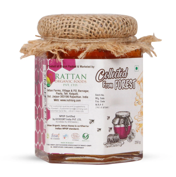 Nutriorg USDA Certified Organic Jamun Honey is a forest Honey. This Jamun honey is 100% pure and unadulterated. Jamun honey helps in the maintenance of blood sugar levels. It helps to heal wounds and works as an antiseptic. It helps in weight loss and is a good source of energy. Honey works as a good substitute of sugar. It helps prevent cough and cold. Black plum is a very famous Indian fruit and is well known as Jamun. It belongs to the Myrtaceae family. Jamun Honey is sourced from bees that feed and forage primarily on wild forest Jamun blossoms. It is collected from Dudua National Park & Sunderbans and harvested in June/July when the flowers blossom. Jamun honey possesses the essence of Jamun flora in its divine form. Nutriorg USDA Certified Organic Jamun Honey has a low glycemic index which keeps blood sugar levels under check. Honey contains an enzyme that makes hydrogen peroxide which makes it antibacterial and anti-fungal. Alongside excellent nutritional values, it can be also used as a calming and sedative agent. Nutriorg Certified Organic Jamun Honey improves metabolism, which keeps the body slim and fit. It is a rich source of antioxidants. Organic Jamun Honey has anti-inflammatory effects. It is used to provide relief from cough, cold and sore throat pain. It is comparatively less sweet compared to other honeys, it is said to have a wonderful lingering aftertaste.