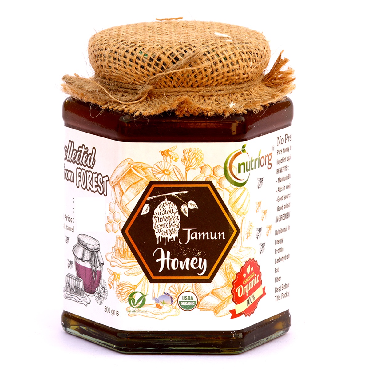 Nutriorg USDA Certified Organic Jamun Honey is a forest Honey. This Jamun honey is 100% pure and unadulterated. Jamun honey helps in the maintenance of blood sugar levels. It helps to heal wounds and works as an antiseptic. It helps in weight loss and is a good source of energy. Honey works as a good substitute of sugar. It helps prevent cough and cold. Black plum is a very famous Indian fruit and is well known as Jamun. It belongs to the Myrtaceae family. Jamun Honey is sourced from bees that feed and forage primarily on wild forest Jamun blossoms. It is collected from Dudua National Park & Sunderbans and harvested in June/July when the flowers blossom. Jamun honey possesses the essence of Jamun flora in its divine form. Nutriorg USDA Certified Organic Jamun Honey has a low glycemic index which keeps blood sugar levels under check. Honey contains an enzyme that makes hydrogen peroxide which makes it antibacterial and anti-fungal. Alongside excellent nutritional values, it can be also used as a calming and sedative agent. Nutriorg Certified Organic Jamun Honey improves metabolism, which keeps the body slim and fit. It is a rich source of antioxidants. Organic Jamun Honey has anti-inflammatory effects. It is used to provide relief from cough, cold and sore throat pain. It is comparatively less sweet compared to other honeys, it is said to have a wonderful lingering aftertaste.
