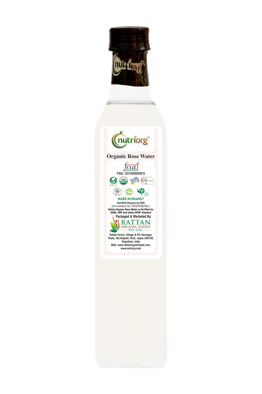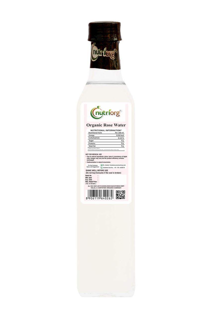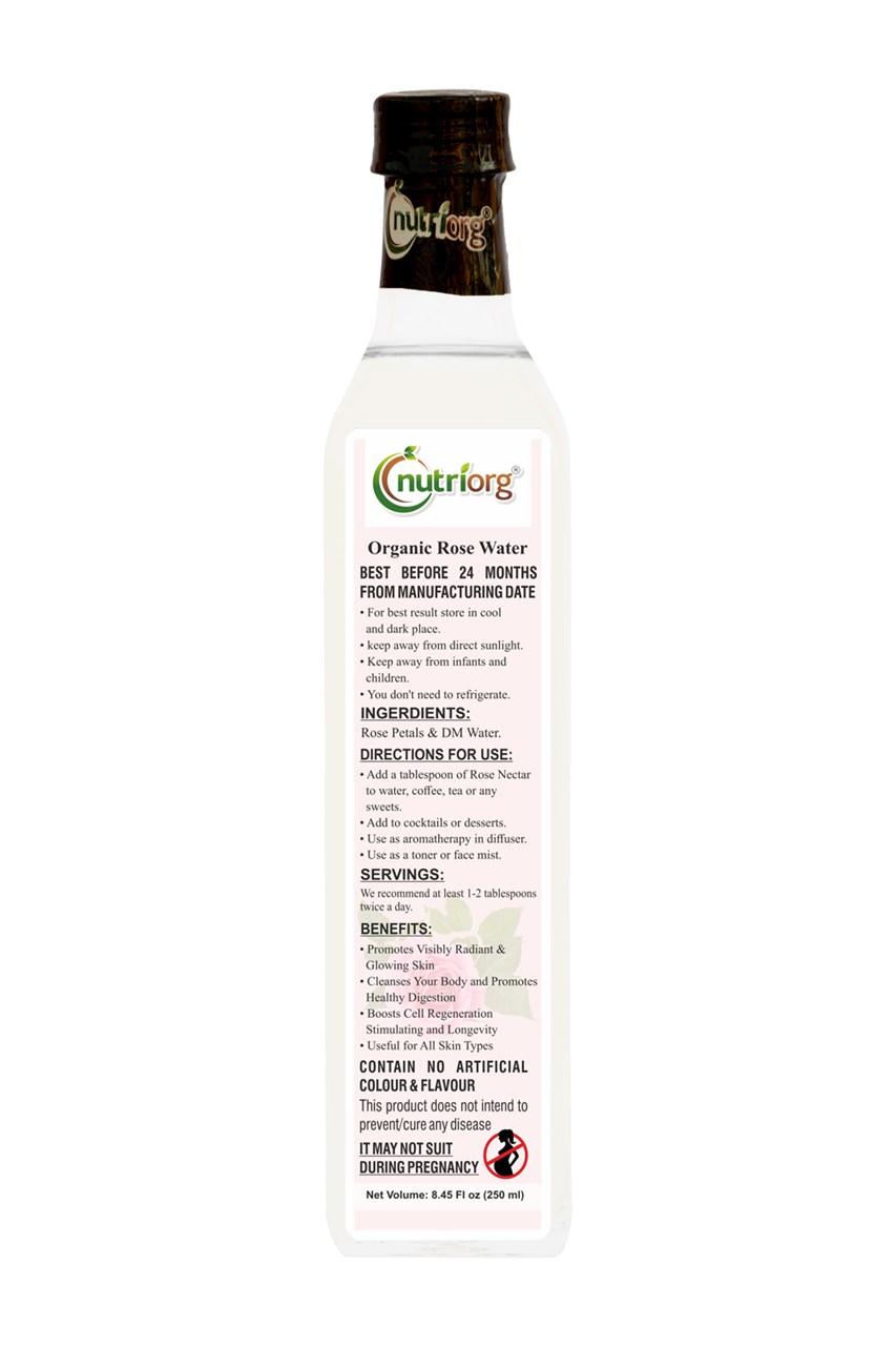 The Nutriorg Organic Rose water is free from any added artificial colour and flavor. It is made from only rose petal extracts and DM water. It is 100% purely organic.