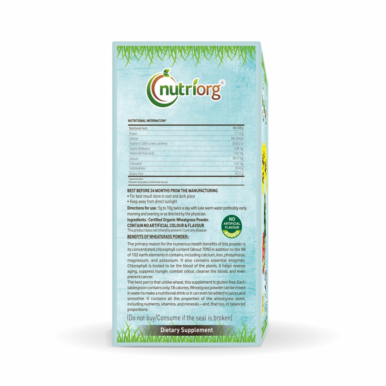 Nutriorg certified organic wheat grass powder is made from certified organic wheat grass cultivated in certified organic farmland. Nutriorg Wheat Grass Powder is a certified organic powder. The primary reason for the numerous health benefits of the Nutriorg certified organic Wheat Grass Powder is its concentrated Chlorophyll content (about 70%) in addition to the 98 earth elements it contains including Calcium, Iron, Phosphorus, Magnesium and Potassium. It is also rich in essential enzymes. The best trait being that unlike wheat, wheat grass powder is gluten free. Nutriorg Certified Organic Wheat Grass Powder contains all the properties of the Wheat Grass plant including nutrients, Vitamins and minerals in a perfect balance. Nutriorg Certified Organic Wheatgrass Powder can be mixed in water to make a nutritional drink and can even be added to juices and smoothies