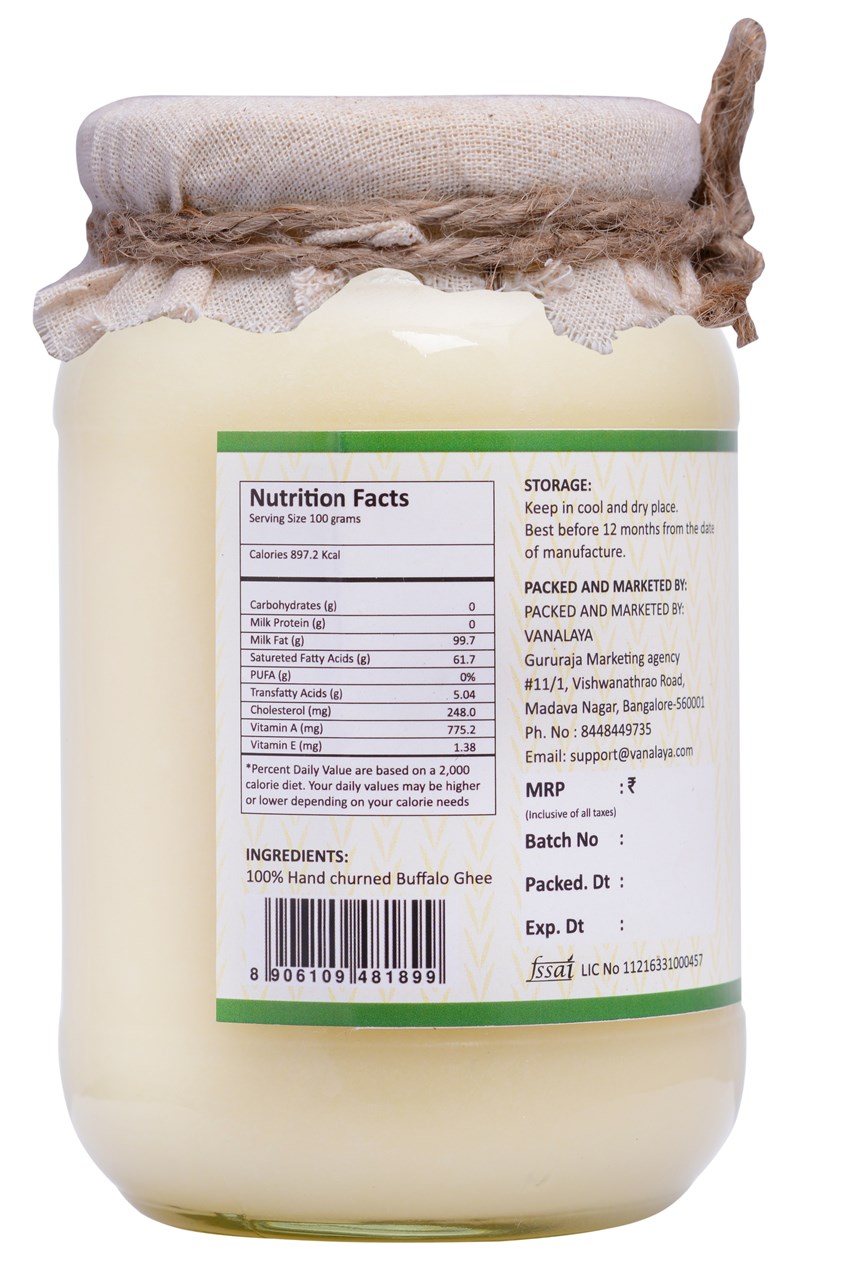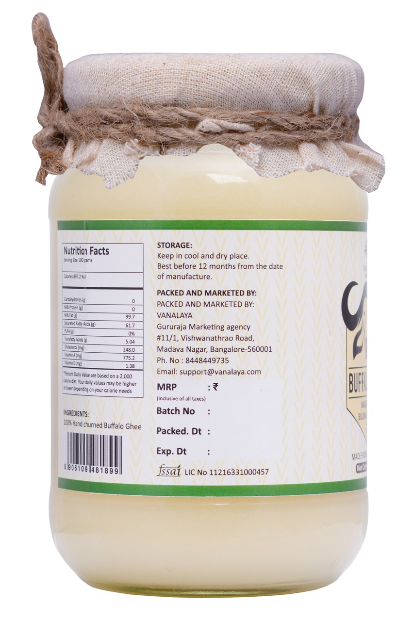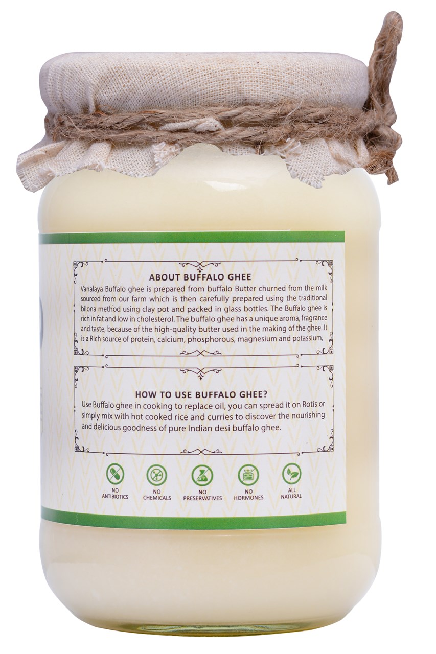 Vanalaya Buffalo ghee is prepared from buffalo Butter churned from the milk sourced from our farm which is then carefully prepared using the traditional Bilona method using clay pot and packed in glass bottles. Vanalaya Buffalo ghee is rich in fat and low in cholesterol. The buffalo ghee has a unique aroma, fragrance and taste, because of the high-quality butter used in the making of the ghee. It is a Rich source of protein, calcium, phosphorous, magnesium and potassium, that provides multiple health benefits. Our buffalo Ghee is pure & made with 100% organic buffalo butter, acquired from grass-fed buffalos on small family farms