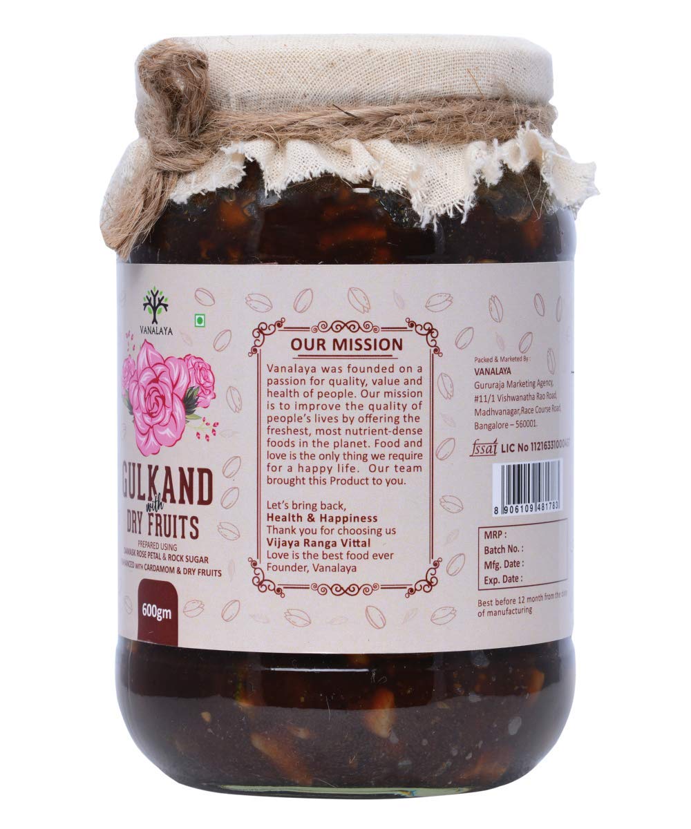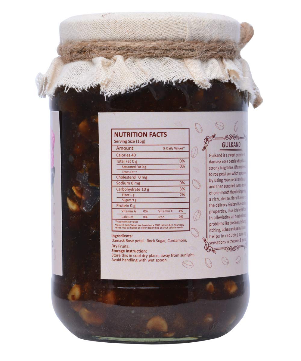 Gulkand is one of the most delicious Ayurvedic preparations known to mankind. Gulkand is a sweet preserve of rose petals and is made primarily of rose petals, which are collected at their peak. Place the rose petals and sugar in layers in a wide-mouthed airtight glass jar. Gulkand is a sweet preserve of damask rose petals which has a strong fragrance. Often referred to roe petal jam which is prepared by using rose petals and sugar and then sundried over a period of one month thereby imparting a rich, dense, floral flavour to the delicacy. Premium Dry fruits Gulkand With Saffron Has original rose petals in it which has a sweet as well as mouth refreshing taste with dry fruits added in it.
