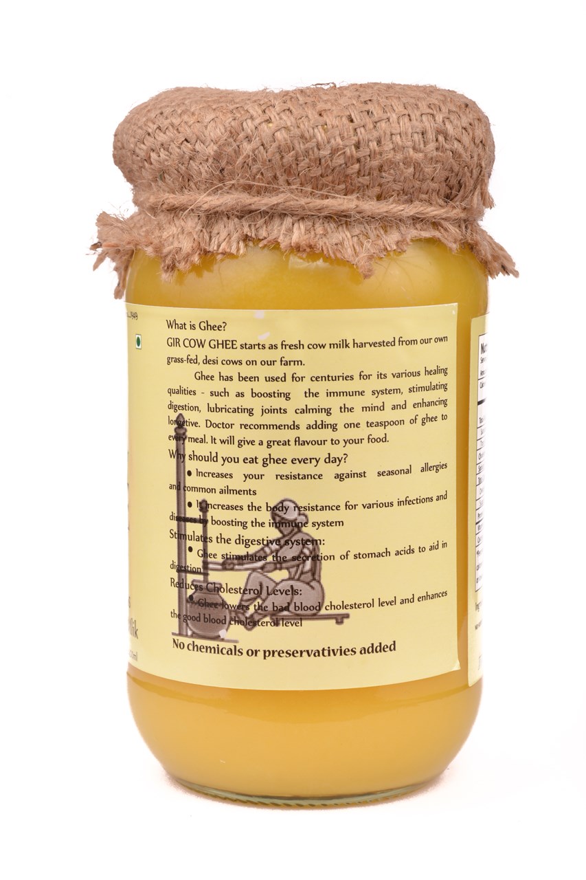Gir Ghee (Pure A2 Gir Cow Ghee) is made from milk collected from grass-fed desi Gir cows. We prepare Desi-Ghee by traditional method. This Vedic method is the best process to prepare Desi-Ghee. The traditional method of making ghee (Bilona) is quite elaborate. Cow's milk is boiled and cooled. Then a spoonful of curd is added to this milk and kept at room temperature overnight. The curd is then churned to extract butter from it. This butter is then boiled so that the water evaporates leaving behind pure ghee.