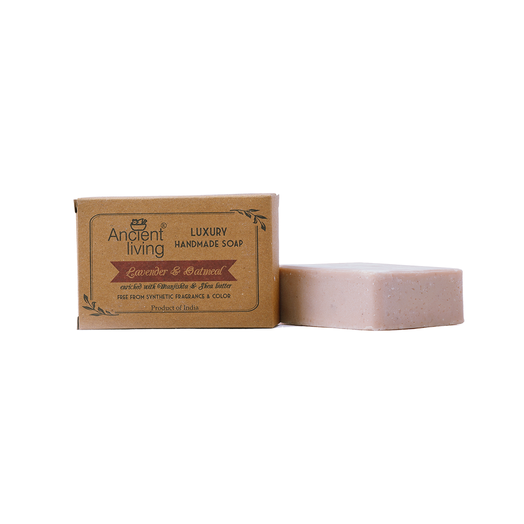 Ancient Living Lavender & Oatmeal Handmade Soap is enriched with pure lavender oil, oatmeal powder and manjistha along with other along nutrient-rich skin nourishing oils. This lavender soap pampers your skin and calms your seems. It breaths back life in your skin as you sweep its rich, creamy lather all over your body! This refreshing bar is infused with lavender oil which is known for its antibacterial and sedative properties. These lavender soap benefits keep you away from potential skin diseases while calming your senses. The oatmeal powder in this sudsy bar provides gentle exfoliation. The other skin nourishing oils moisturize and nourish your skin. This lavender oatmeal soap gives you glowing skin and leaves your skin feeling soft and supple. Indulging in this mesmerizing bar relaxes and rejuvenates your mind!" Benifits: "Lavender oil It restores skin complexion and reduces acne. Its anti-inflammatory and antioxidant properties reverse signs of aging. It protects you from potential skin diseases. Its antidepressant properties improves your mood, reduces anxiety and stress. Its sedative properties relax your mind and lull you to sleep. It leaves your skin with a refreshing aroma. It relieves your sore muscles. Oatmeal powder It moisturizes and soothes your skin. It acts as an exfoliator by removing dead skin cells. It aids in treating acne. It lubricates and protects your skin against harsh pollutants. Manjistha It improves your overall complexion. Its antibacterial and anti-inflammatory properties fight acne and other skin diseases. It has detoxifying properties. Jojoba oil It is enriched with vitamin E and B which hydrates and moisturizes your skin. It is quickly and easily absorbed into the skin which will make your skin glow. It protects the skin against pollution and restores skin health. Shea butter It is naturally enriched with vitamins A, E & F. It soothes and moisturizes your skin. It helps retain the skins natural oils. Olive oil It moisturizes your skin. The light texture of olive oil makes it a perfect non-sticky moisturizer. It is rich in Vitamin E which protects your skin from harmful UV rays. It acts as a gentle exfoliator and gets rid of impurities. It improves skin health and imparts a healthy glow. Coconut oil Our coconut oil is organic and certified. This age-old oil nourishes your skin and eliminates toxins. It acts as an exfoliator and removes dead skin cells. It combats dryness and moisturizes your skin. Palm oil It is loaded with antioxidants and vitamin A which protects your skin from harmful UV rays while keeping the skin soft and non-greasy. Wheat germ oil: Wheat germ oil is a rich source of vitamin E which helps to reduce skin damage, supports healthy skin and an even skin tone. Lye & DM Water: Purified water. Ayurvedic proprietary medicine. LAVENDEROAMEAL SOAP BENEFITS: Its excellent for all skin types, especially for dry skin types. It relieves your sore muscles. Nourishes and exfoliates your skin. Relieves stress and fatigue and uplifts your mood. Restores the suppleness of your skin. Removes impurities and reduces tan. It helps maintain a clear skin tone. Promotes a clear, glowing complexion. " Ingredients: Lavendar oil, Oatmeal powder, Manjishta, Jojoba oil, Shea butter, Olive oil, Wheat germ oil, Coconut oil, Palm oil, Lye & DM Water, Ayurvedic proprietary medicine. How to use: Wet body and face,apply generously and rinse.