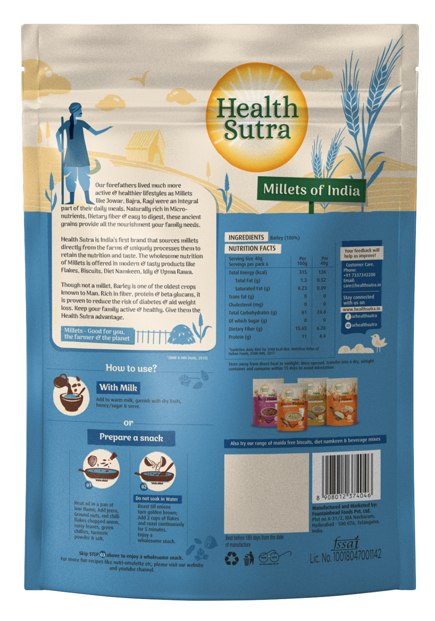 Highly nutritious breakfast cereal/flakes. Skip Oats/Cornflakes - Eat barley flakes Made from Barley grain. These Barley flakes can be had with hot milk for breakfast and can be used to make Chiwda (roasted snack)" "1. Add to warm milk. Add honey/sugar as necessary. Adding dry fruits optional 2. For Chiwda - Add seasoning grains and spices; salt along with a Tbsp of oil to a kadai. Add Barley Flakes once the seasoning grains are popping. Keep roasting on Med. Flame for 5-8 min till flakes turn crispy