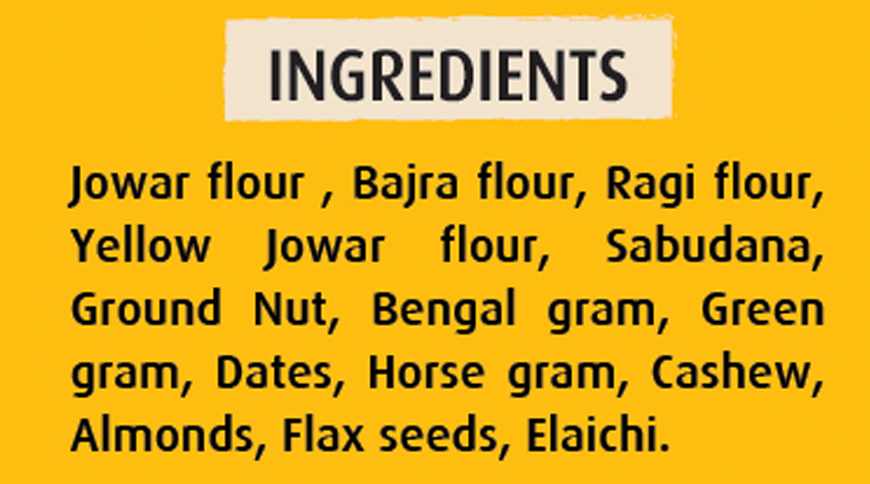 Nutritious & tasty blend contains Ragi; Jowar; Bajra; Barley; Badam; Cashew; Flax seeds; Moong Dal; Dates; Elaichi and others. 100g Jaggery Powder also included inside the pack How to use: Mix 2 table spoons of Healthsutra Health Mix in 250ml of cold water/milk and heat it on the stove for 4-5 mins while stirring continuously. Add jaggery and serve warm