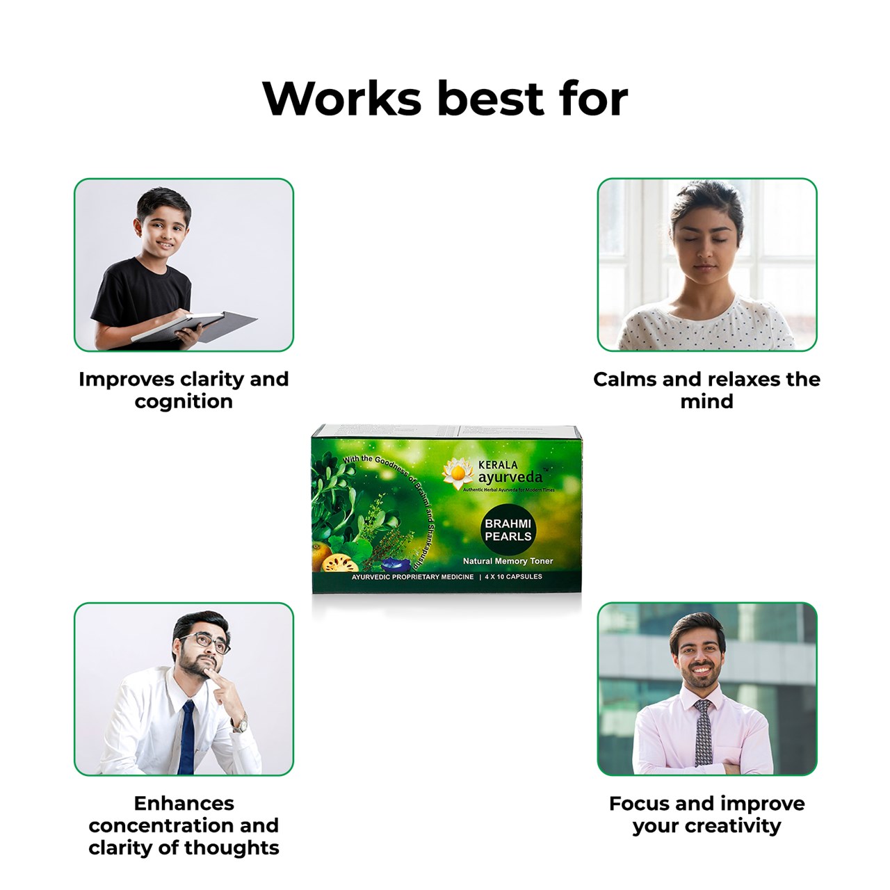 Whether you are a student or a working professional, you need a sharp intellect to perform optimally at work and in studies. The ability to think smart, see through the clutter, categorize your thoughts as well as to memorize always helps at work, studies and in day-to-day life. Kerala Ayurveda’s Brahmi Pearls are rich with memory enhancers and natural cognitive enhancer herbs such as Brahmi, Mandukaparni & Shankhpushpi. These herbs have popularly been used for centuries as supplements to improve memory and cognitive abilities. Our Brahmi Pearls are small capsules that you can carry with yourself and take on-the-go.