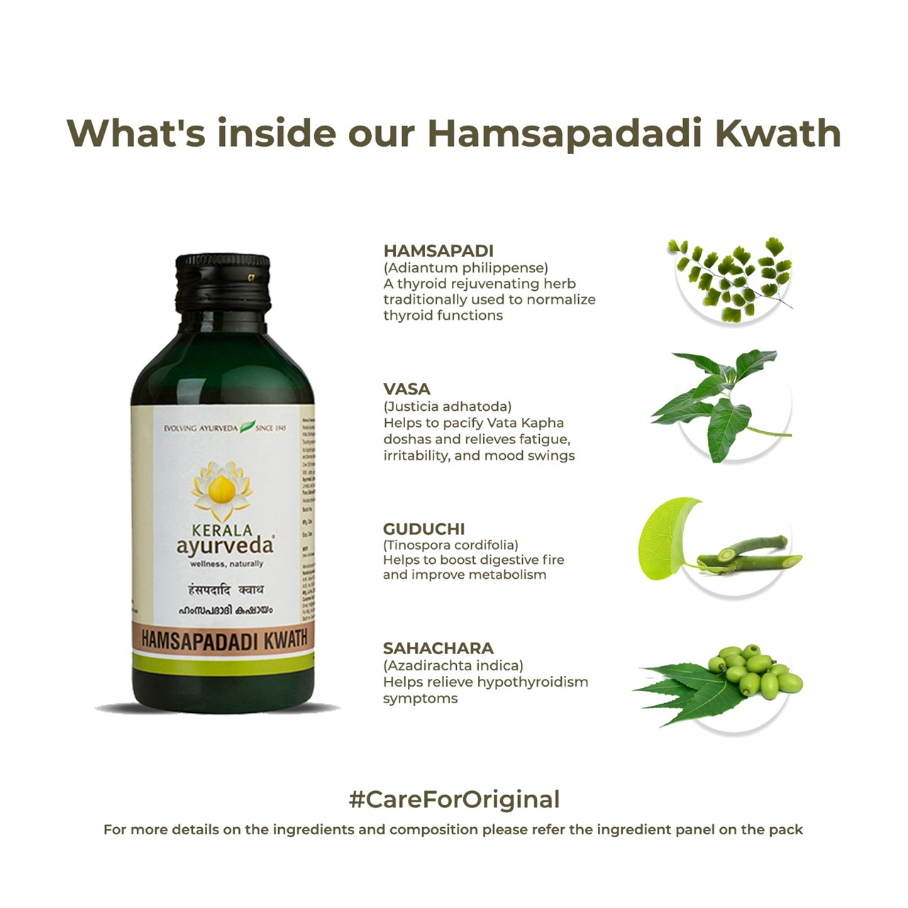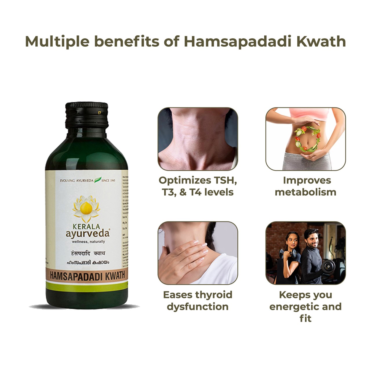 - Eases thyroid dysfunction - Kerala Ayurveda Hamsapadadi Kwath is an ideal tonic to fight thyroid dysfunctions. It helps to relieve mild-to-moderate hypothyroidism and hyperthyroidism and keeps your thyroid young and lively.