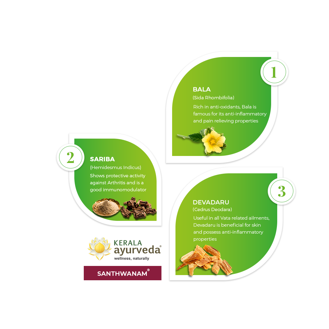Santhwanam Oil helps improve blood circulation, mental clarity and also strengthens all tissues, improving strength and longevity. It is not only effective in joint issues but also relaxes the mind and acts as an emollient to the Skin, which tones it up through essential nourishment and moisturization. The experts at Kerala Ayurveda, have formulated a consolidated solution called SANTHWANAM OIL to help you in countering some crucial symptoms of health deteriorating problems.