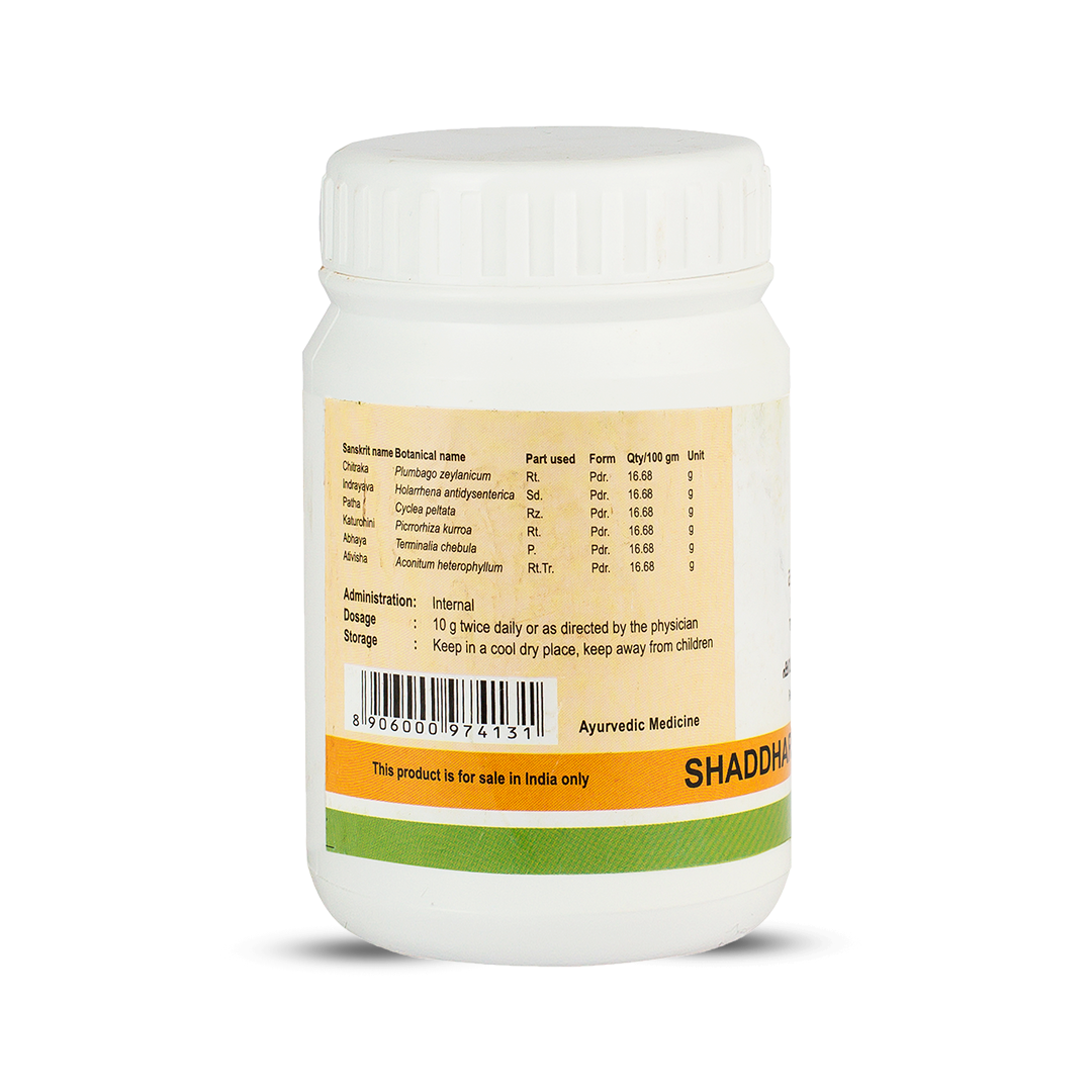 Kerala Ayurveda Shaddharana Choornam Tablets are perfectly curated, with six herbal ingredients in equal quantities. It is an Ayurvedic medicine for gastric conditions and helps improve digestion. Shaddharana Choornam Tablets are used for various digestive disorders ranging from gas trouble, abdominal bloating, indigestion, constipation, and diarrhea. It is used as a supplement for correcting metabolic insufficiency and associated conditions such as weight loss and cholesterol levels. Shaddharana Choornam Tablet also benefits in relieving symptoms associated with musculoskeletal and skin conditions.