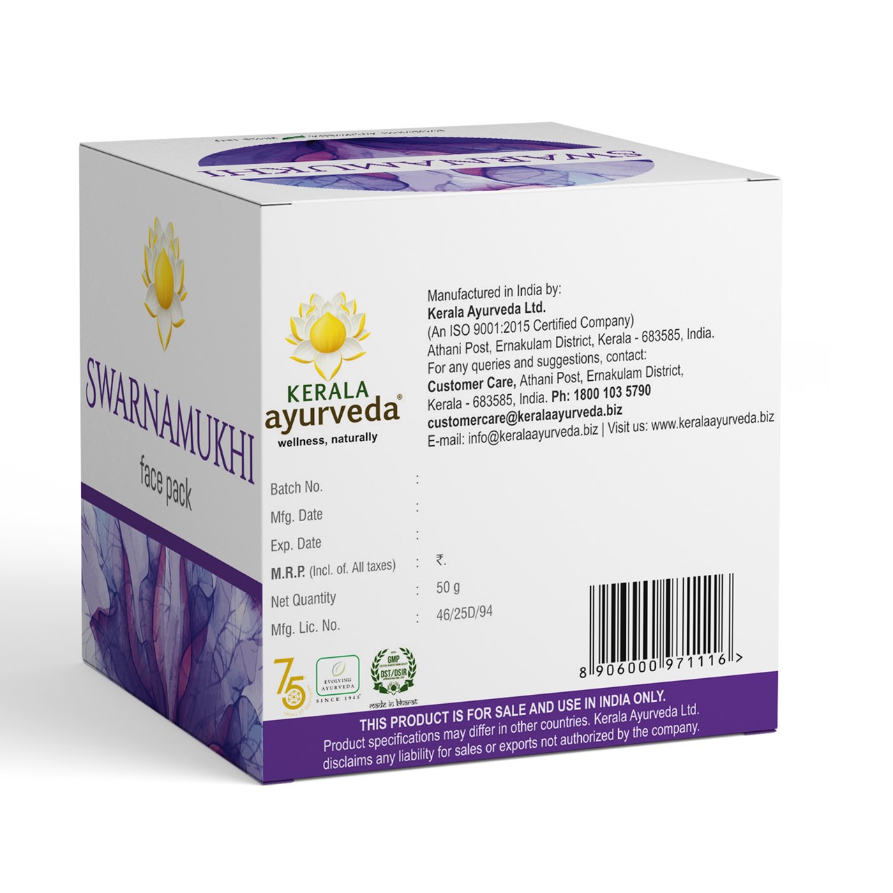 Swarnamukhi Facepack is a cleansing and exfoliating herbal face pack for improving the smoothness, luminosity and youthful vibrancy of skin.