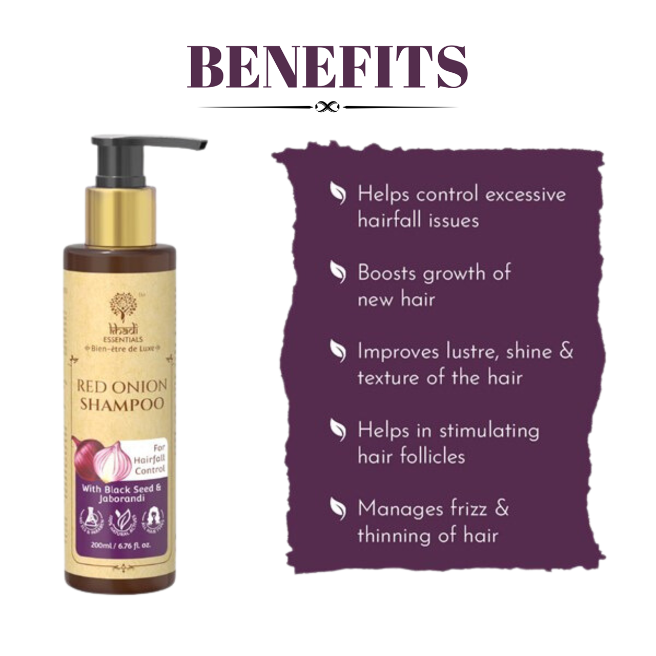 Get strong healthy and spa-like hair with Khadi Essentials Red Onion & Black Seed Oil Hair Shampoo and Conditioner that is made from age-old Ayurvedic & potent Jaborandi Oil & Vitamin E. The hair shampoo helps reduce hair fall, promotes hair growth, and strengthens the hair shaft. Fortified with Curry Leaves & Hibiscus, it gives visible shine, bounce & strength to the hair.