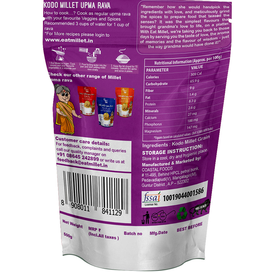 Kodo millet is a good substitute for rice or wheat. Protein, fiber, and mineral content are much higher than the major cereals like rice. It can be cooked just like rice or ground into flour. It provides balanced nutrition, unlike polished white rice. Regular consumption of kodo millet is very beneficial for postmenopausal women suffering from signs of cardiovascular disease, like high blood pressure and high cholesterol levels.