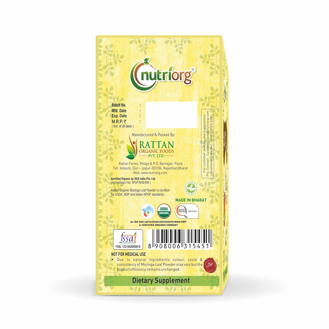 Nutriorg Certified Organic Moringa Powder is made from moringa leaf cultivated in certified organic farmlands. It is an excellent source of vitamin A, vitamin C, vitamin E, and bioflavonoids. These nutrients help in blocking the oxidation of healthy tissues by active oxygen, thus delaying the ageing process and reducing the appearance of fine lines and wrinkles. Moringa powder contains all the essential nutrients, vitamins, and minerals conducive to healthy hair. It is loaded with high contents of vitamins E and C.