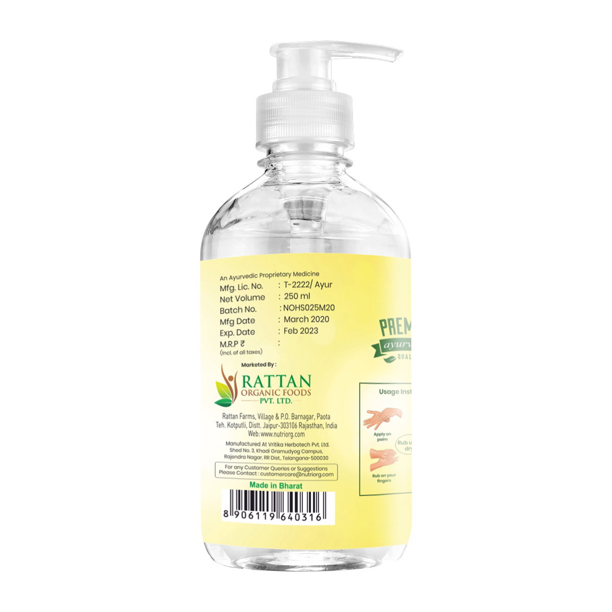 Nutriorg Elovra Hand Sanitizer Hand Sanitizer is applied on hands for the purpose of removing common pathogens (disease-causing germs). It usually comes in the liquid form. It is employed as a simple means of infection control in a wide variety of settings (Indoors & Outdoors). Most hand sanitizers have high amounts of alcohol that kills the germs but makes your skin dry and takes away its moisture while evaporating. But the Nutriorg Ayurvedic Hand Sanitizer kills 99.99 % Germs along with nourishing your skin. It contains Aloe vera, Tea-tree Oil, Lemon, Neem, Tulsi and Mint that takes care of your skin. The Sanitizer does the perfect job without harming your skin each time is being used. It can be used innumerable times without worrying about the side effects of Alcohol. It immediately denatures proteins, effectively neutralizing certain types of microorganisms. In general, alcohol-based hand sanitizers, if rubbed thoroughly over finger and hand surfaces for a period of 30 seconds, followed by complete air-drying, can effectively reduce populations of bacteria, fungi, and some enveloped viruses. Despite the variability in effectiveness, hand sanitizers can help control the transmission of infectious diseases, especially in settings where compliance with hand washing is poor.•The Nutriorg Elovra Hand Sanitizer kills 99.99% germs.• It contains Aloe vera , Tea Tree Oil, Lemon, Mint, Neem and Tulsi which are extremely good for the skin• This hand sanitizer is not harsh on the skin but only harsh on the germs.• It moisturizes and sustains skin health and thus can be used innumerable times as required.• It contains glycerin which is a good moisturizing agent for the skin.•Apply on your palms, spread and rub on the back of your hands and fingertips until dry. •It is for external use only. •Keep away from heat and flame. •Avoid contact with eyes. •Rinse thoroughly if there is contact with the eyes. •In case of irritation, discontinue use and fetch medical help.Aloe vera, Tea-tree Oil, Lemon, Neem, Tulsi and Mint