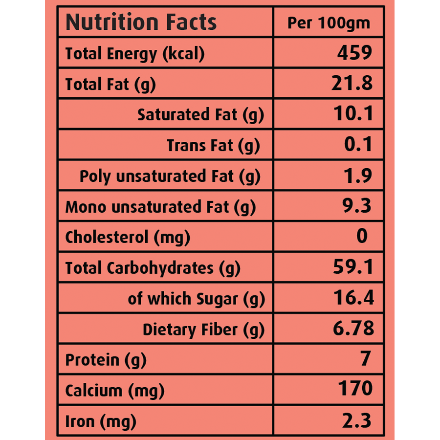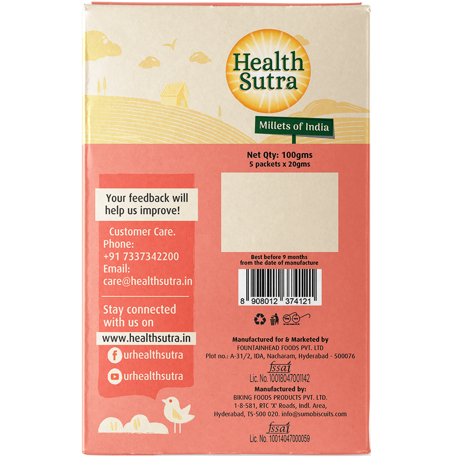 These high-fiber digestive biscuits are made from 100% whole grain Ragi. Ragi is a rich source of antioxidants and calcium which helps in strengthening bones and offers overall well-being. Complex carbohydrates in Ragi keep you filled up for a longer period throughout the day and also help you fight health conditions like Diabetes. These biscuits are a healthy option for you to satisfy your hunger with great taste without compromising on your nutritional needs Enjoy a tasty wholesome biscuit in snack packs of 2 biscuits each