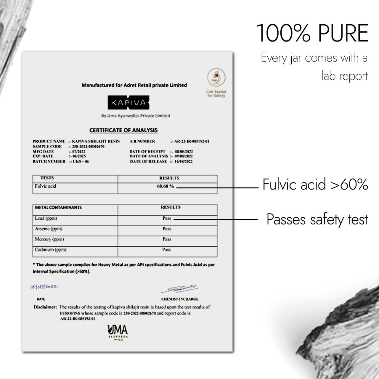 Kapiva Shilajit Resin fuels your body’s real energy source - ATP (Adenosine Triphosphate) helping you stay active, alert, and energized throughout the day. It has 60%+ Fulvic Acid and 80+ essential minerals like Calcium, Iron, Zinc, and Magnesium.