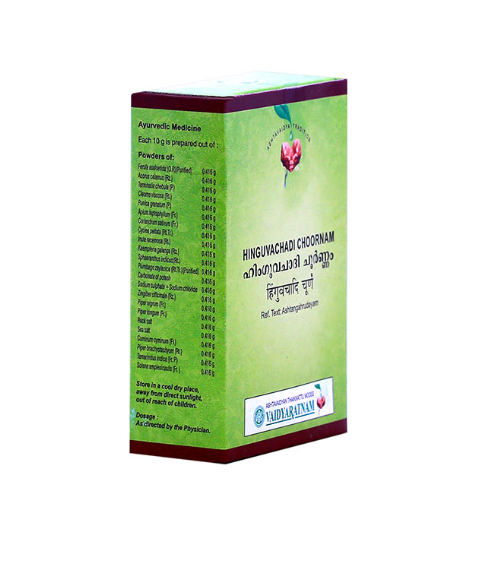 Vaidyaratnam Hinguvachadi Choornam is an Ayurvedic formulation that helps with anorexia, ingestion, haemorrhoids, low back pain, abdominal pain, abdominal distention, and urinary obstruction.