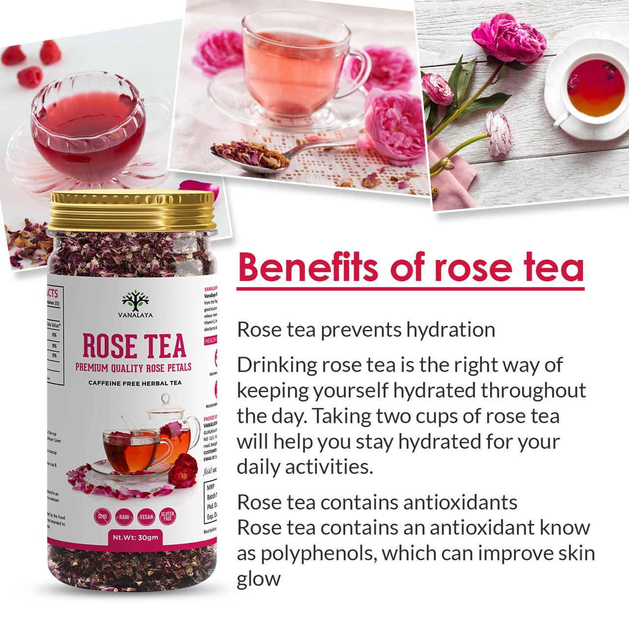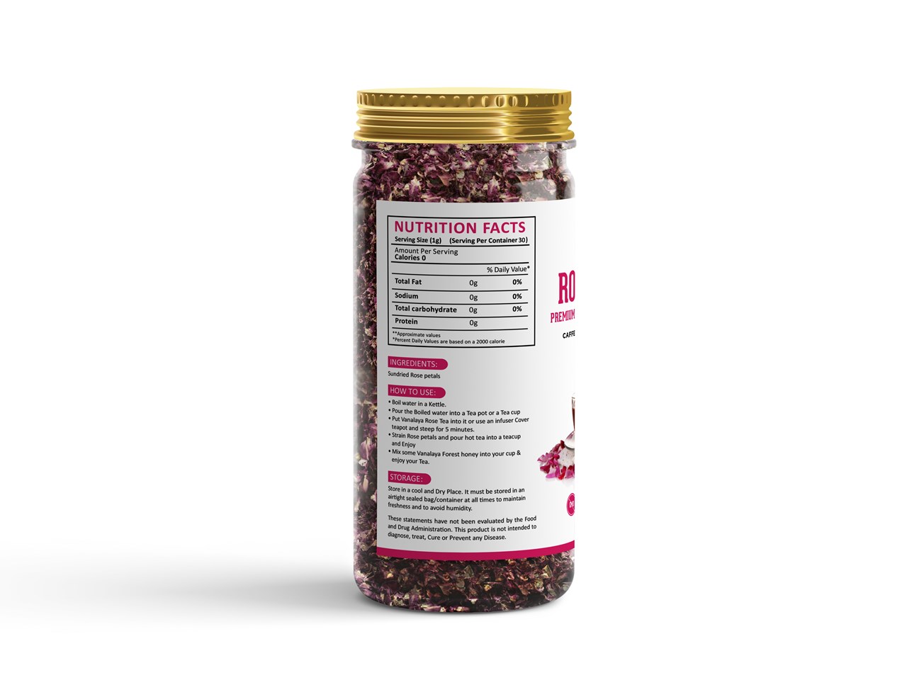 Vanalaya Rose Tea is an aromatic herbal beverage made from the fragrant rose petals. It’s naturally caffeine-free, a good source of hydration, rich in antioxidants, and may help relieve menstrual pain. Rose petals are a good source of Vitamin C, Iron, Calcium, Vitamin A and Vitamin E. Rose tea also burns down body fat and makes you lose weight faster. Rose Petal tea tastes heavenly. The queen of flowers delicately plays with your taste buds and leaves you with a smooth palate giving a subtle floral flavour. Our rose tea is made from real rose petals, which are picked when they are young and then dried. It has a natural rose flavour and aroma, making it a lovely and highly enjoyable drink. It provides a slightly sweet aroma and reddish colour. This tea will be more popular if mixed with other teas. Our rose tea is 100% pure, Natural product without having any artificial or synthetic ingredients. Made from the premium hand picked rose flowers. The pleasant, sweet-scented and ambrosial aroma of rose petals will engulf the atmosphere in its fragrance. When brewed, Rose Petal tea is light golden in colour. The naturally uplifting quality of this tea helps to enhance mood. It's good for those who are feeling down, stressed. The effect that this type of tea can have on hormone levels is well known, this tea can help to relax your mind and keep you calm.