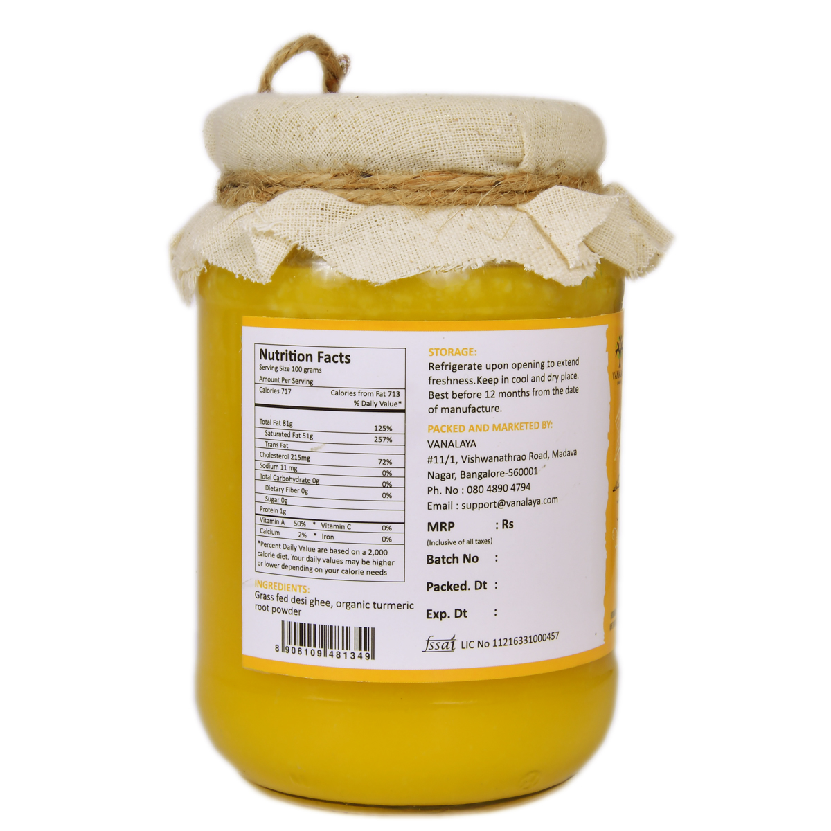 Vanalaya Pure turmeric desi ghee is made from ghee infused with turmeric and has curcumin content of 65% mixed with it. A unique fat-soluble turmeric preparation with the synergy of ghee Each serving is made from 800 mg of organic turmeric powder. The turmeric powder used is naturally rich in curcumin. Traditionally, turmeric is always cooked in ghee The premium A2 milk from the Desi cows is first turned into curd by the Vedic method. We then hand-churn the curd for hours to separate the butter before boiling it to turn it into ghee. We prepare our ghee by the traditional method. This Vedic method is the best process to prepare ghee. Free from pesticides and gluten-free, sugar-free, homemade, natural, no preservative
